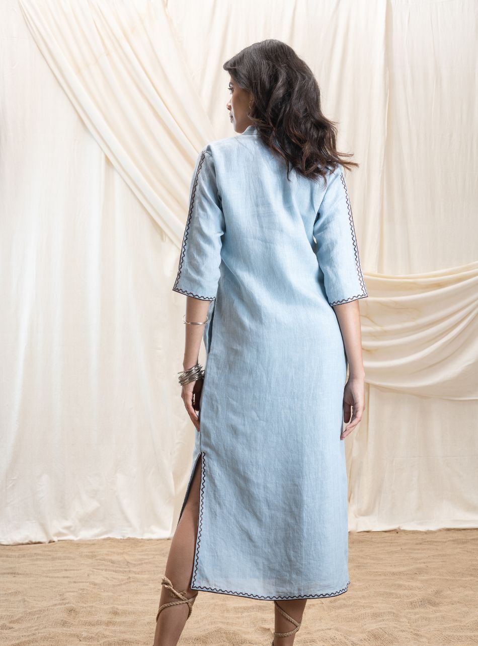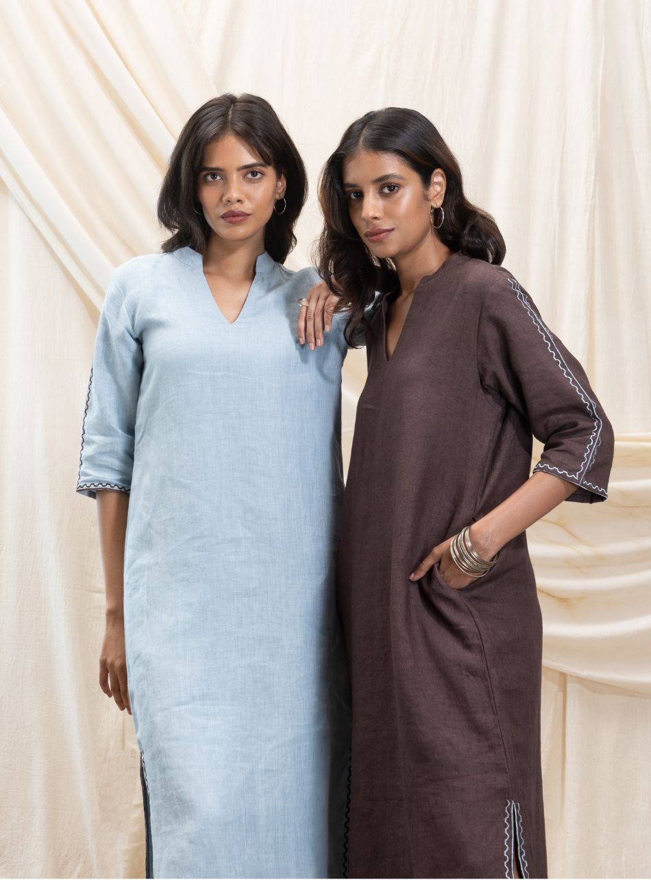 An effortlessly stylish full-length dress designed for comfort and ease. It features practical pockets on both sides and a bold thigh-high slit, beautifully highlighted with our signature line embroidery in a contrasting shade. The 3/4th sleeves, extending till the elbow, are also adorned with delicate line embroidery for a refined touch. A classic mandarin collar adds to its understated elegance, making this piece a perfect blend of simplicity and sophistication.