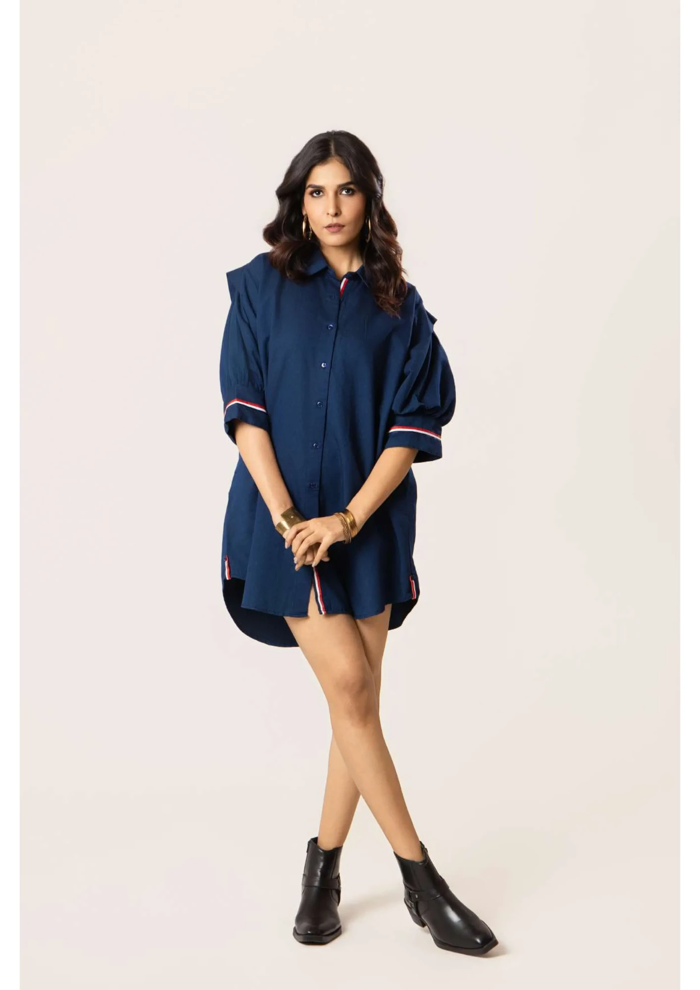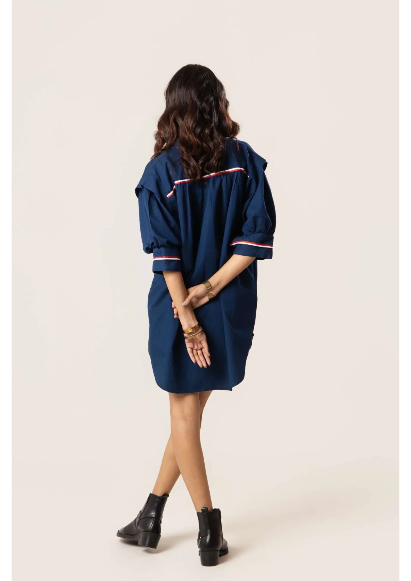 Denim Anti fit dress with tape detailing on button placket, cuff and back yolk. With pleated puff sleeves.