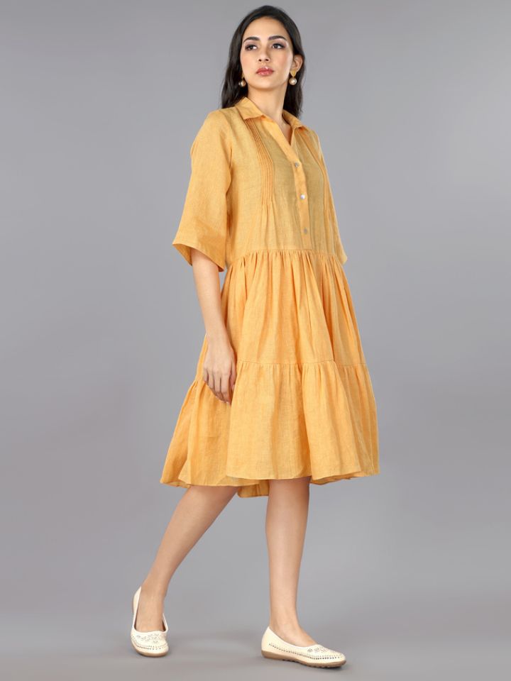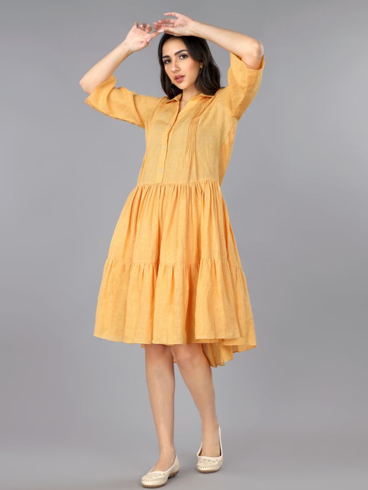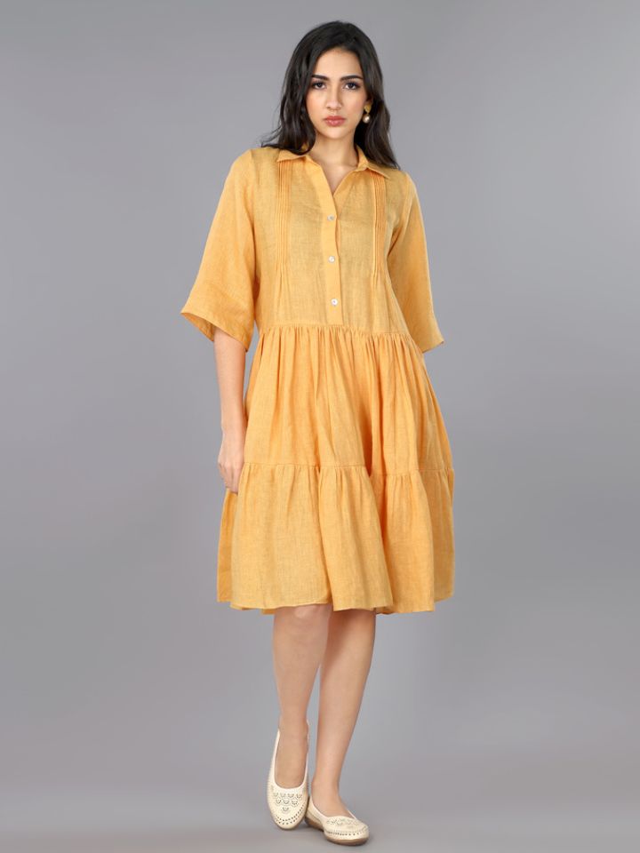 Add a touch of charm and elegance to your wardrobe with this apricot pure linen pleated dress. Designed to balance comfort and style, this dress is crafted for those who love effortless sophistication.