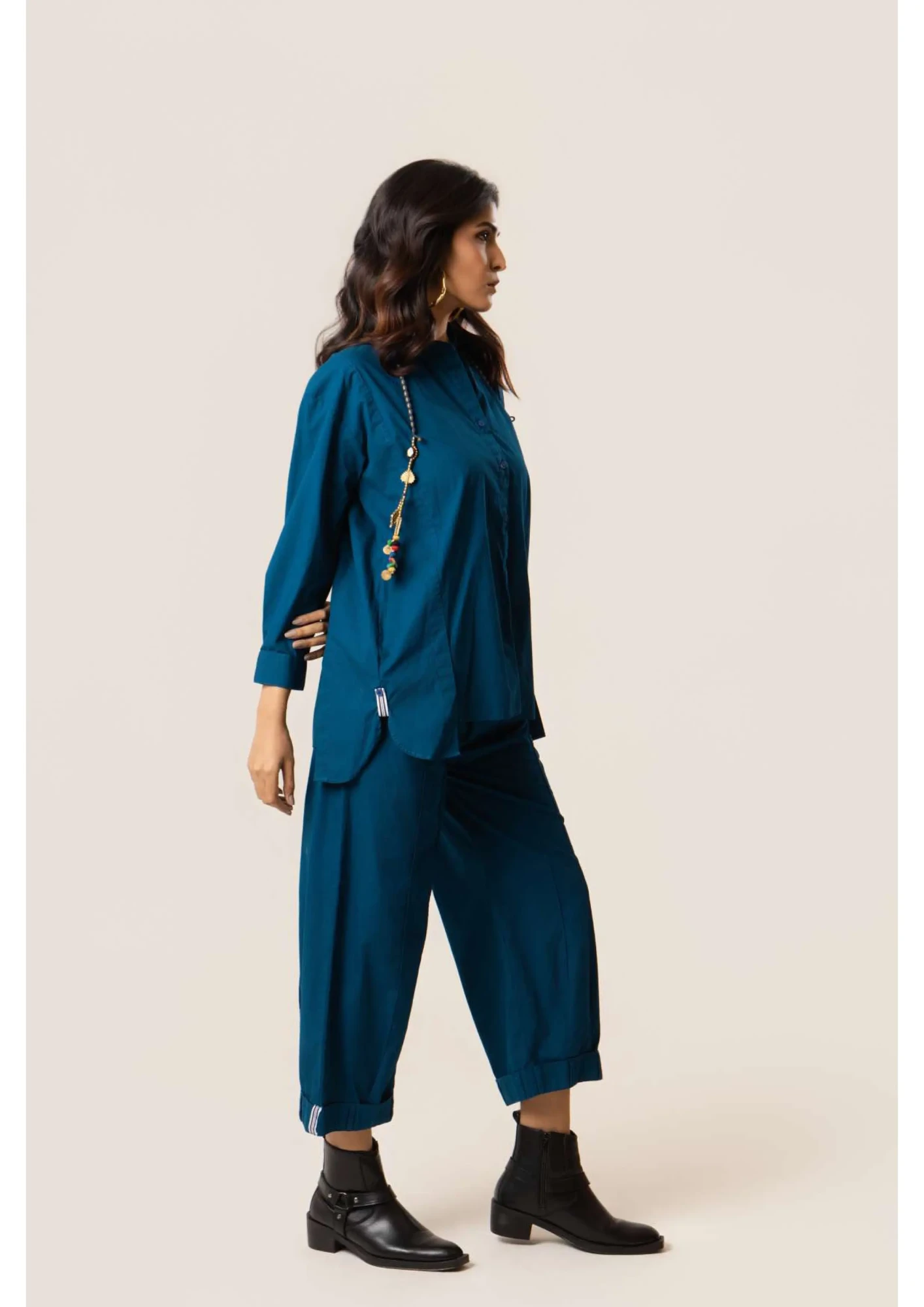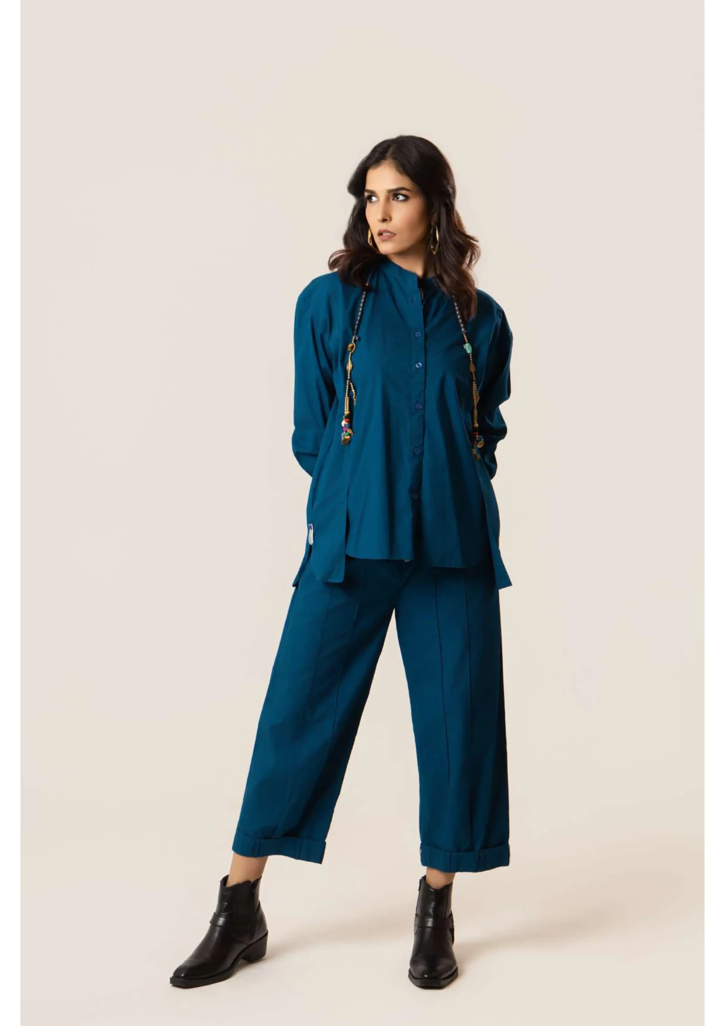 100% Cotton Poplin – Premium Cotton. Anti fit shirt with tape detailing on hem and button placket. Loose fit pants with loop details on hem, belted front and elasticated back.
