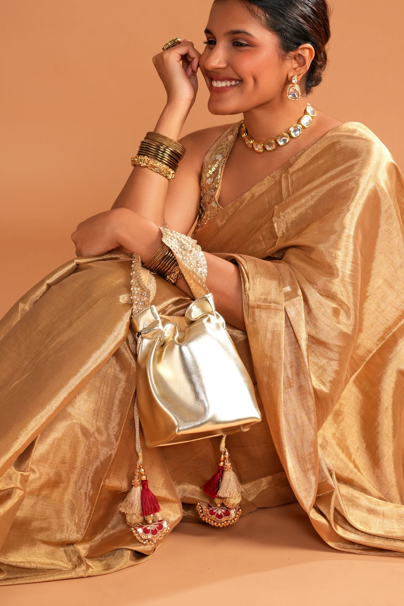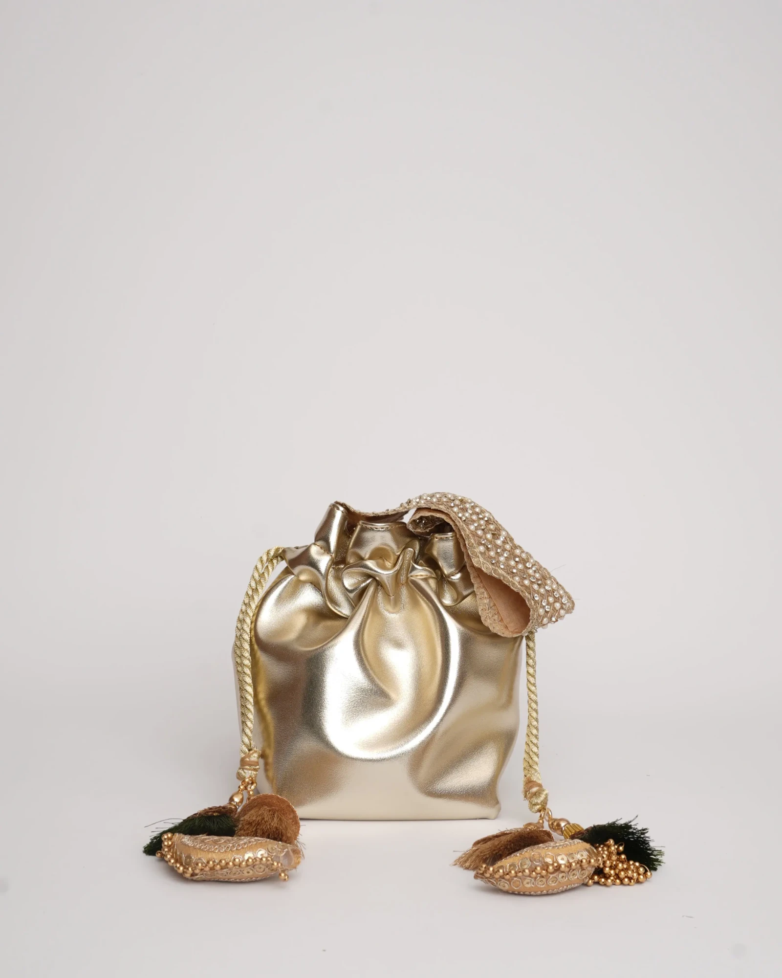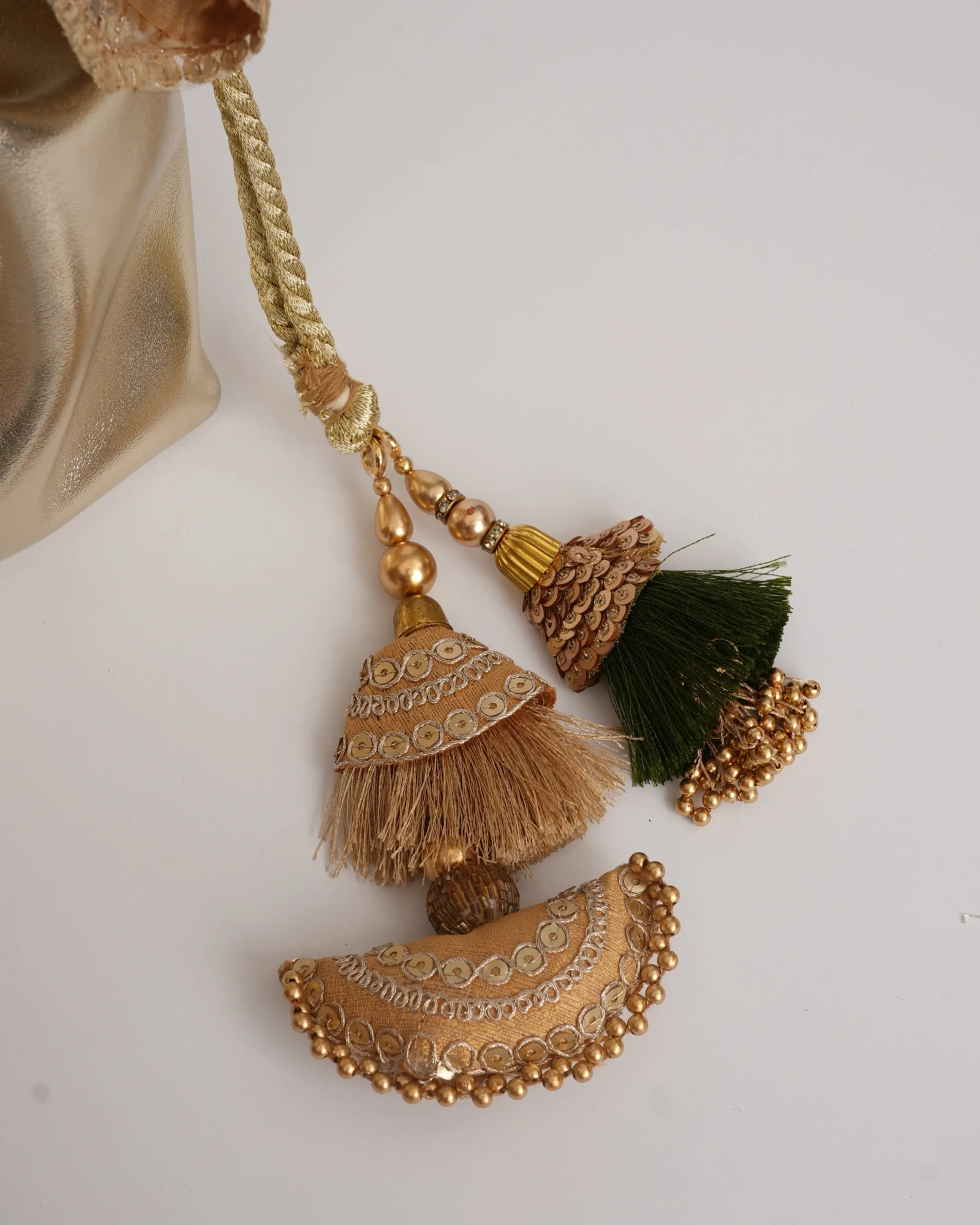 Our hot seller potli, crafted in faux leather in a metallic tone. The handle is constructed from hand embroidered lace and the tie up is finished with stunning tassels. A sureshot stunner!