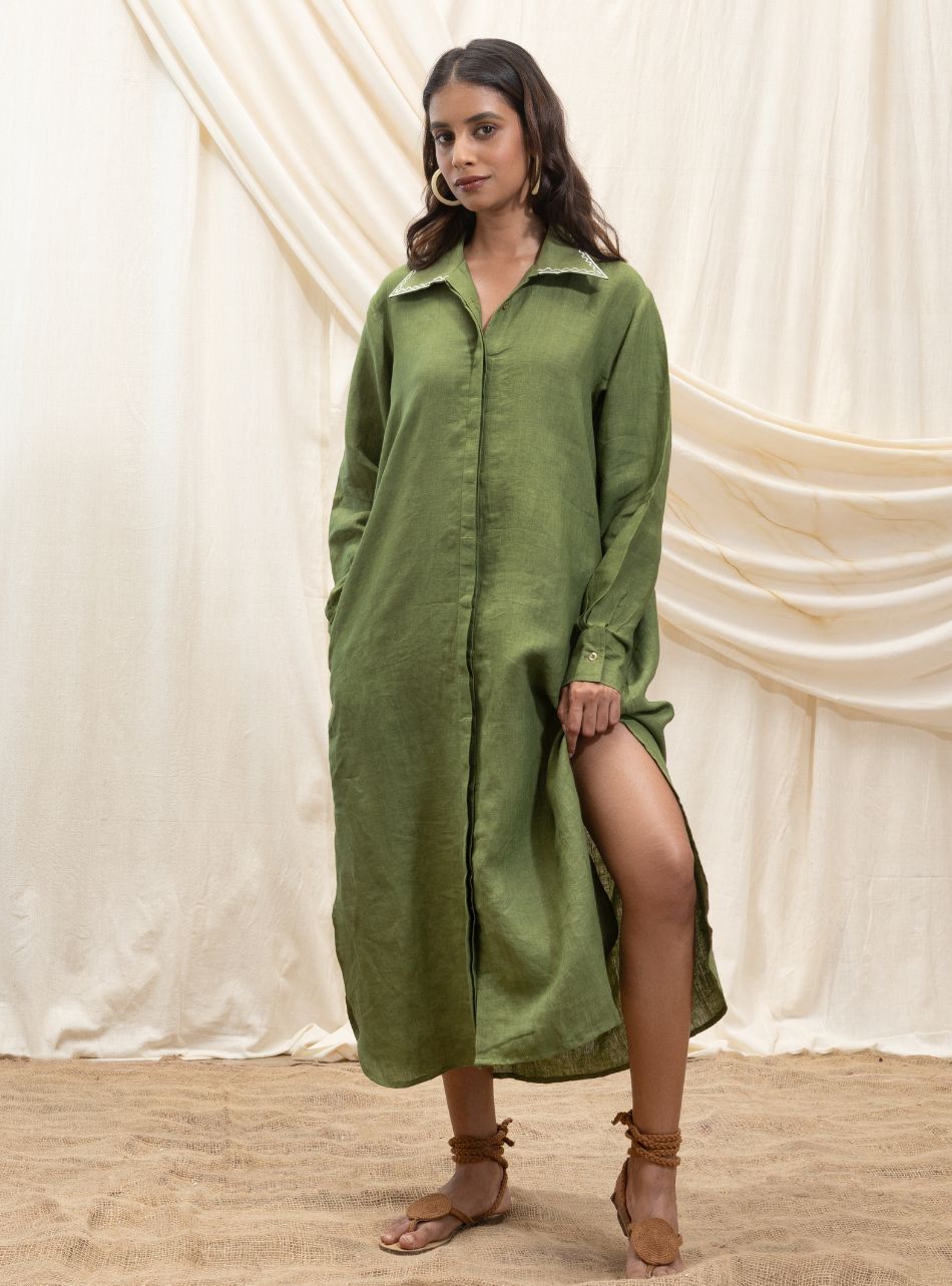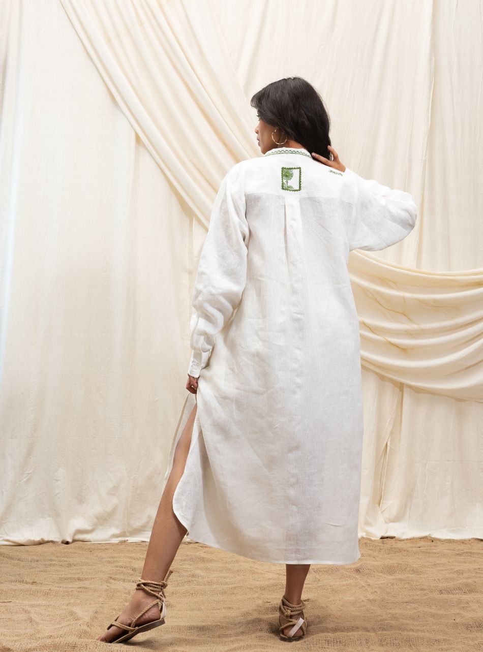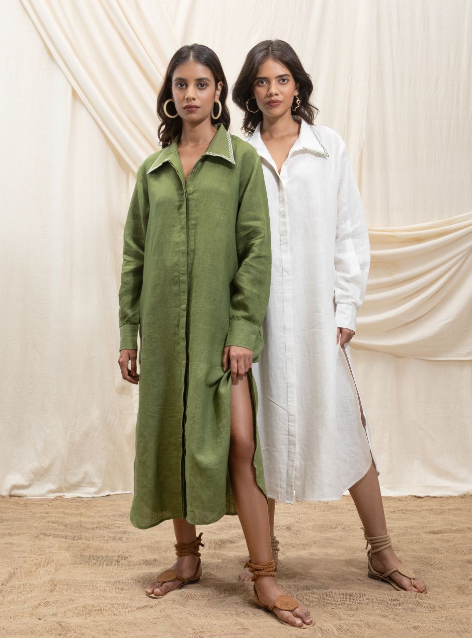 A sophisticated yet effortless full-length shirt dress featuring a bold thigh-high slit for a contemporary edge. Designed with practical pockets on both sides, it blends style with functionality. The collar is accentuated with our signature line embroidery in a contrasting shade, adding a refined detail. At the back, our signature stamp and Akashi logo in Hindi are embroidered in their signature placements. The full sleeves are tailored with a relaxed fit and finished with front cuff button fastenings, enhancing the dress’s cool, laid-back appeal.