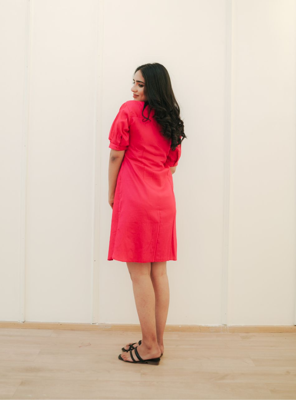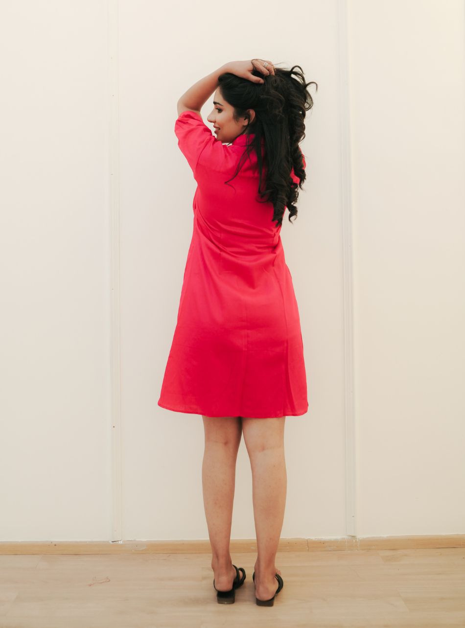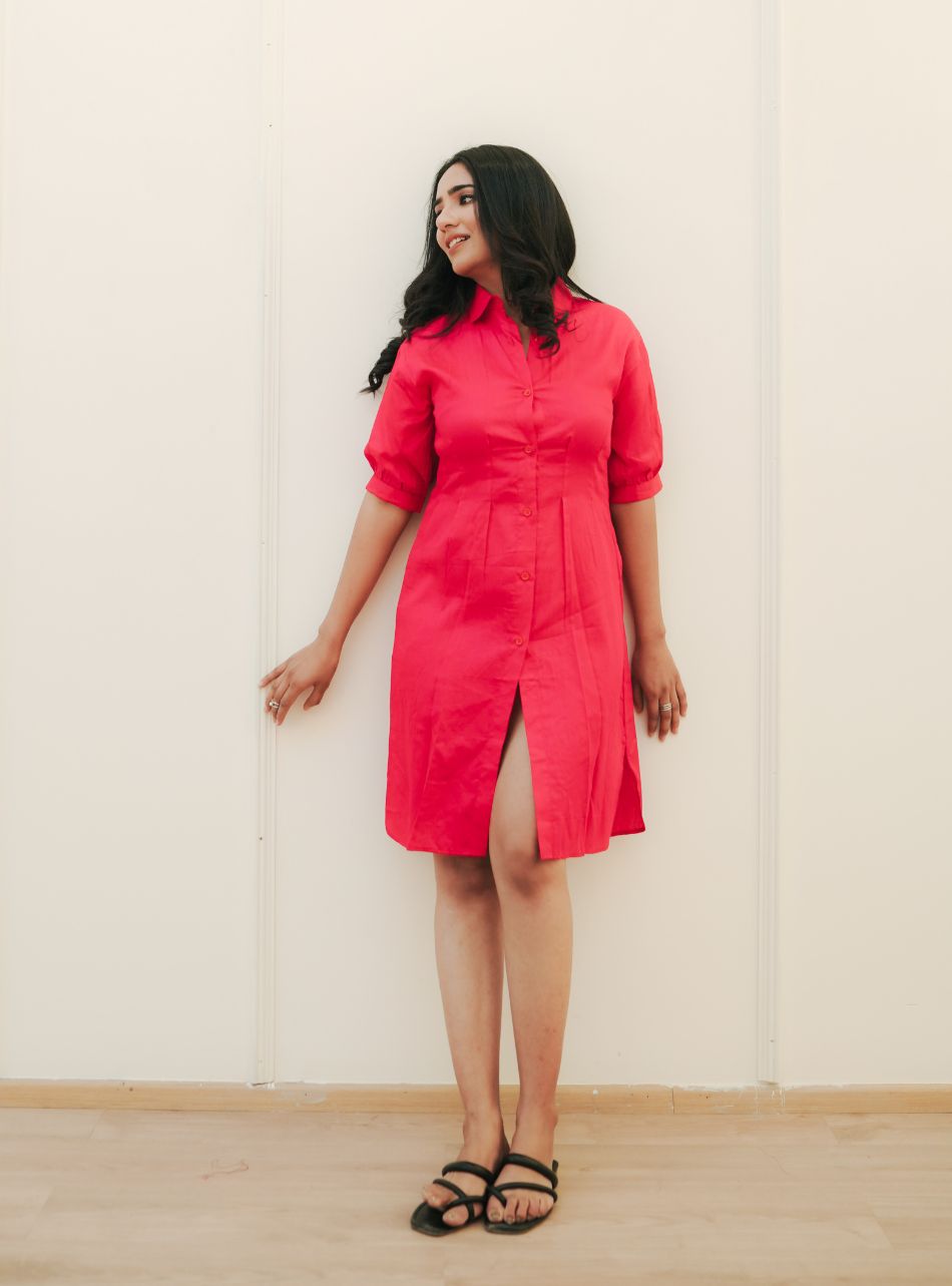 Make a bold statement with the Cherry Shirt Dress. The vibrant color combined with delicate pin tuck detailing offers a harmonious blend of confidence and elegance.