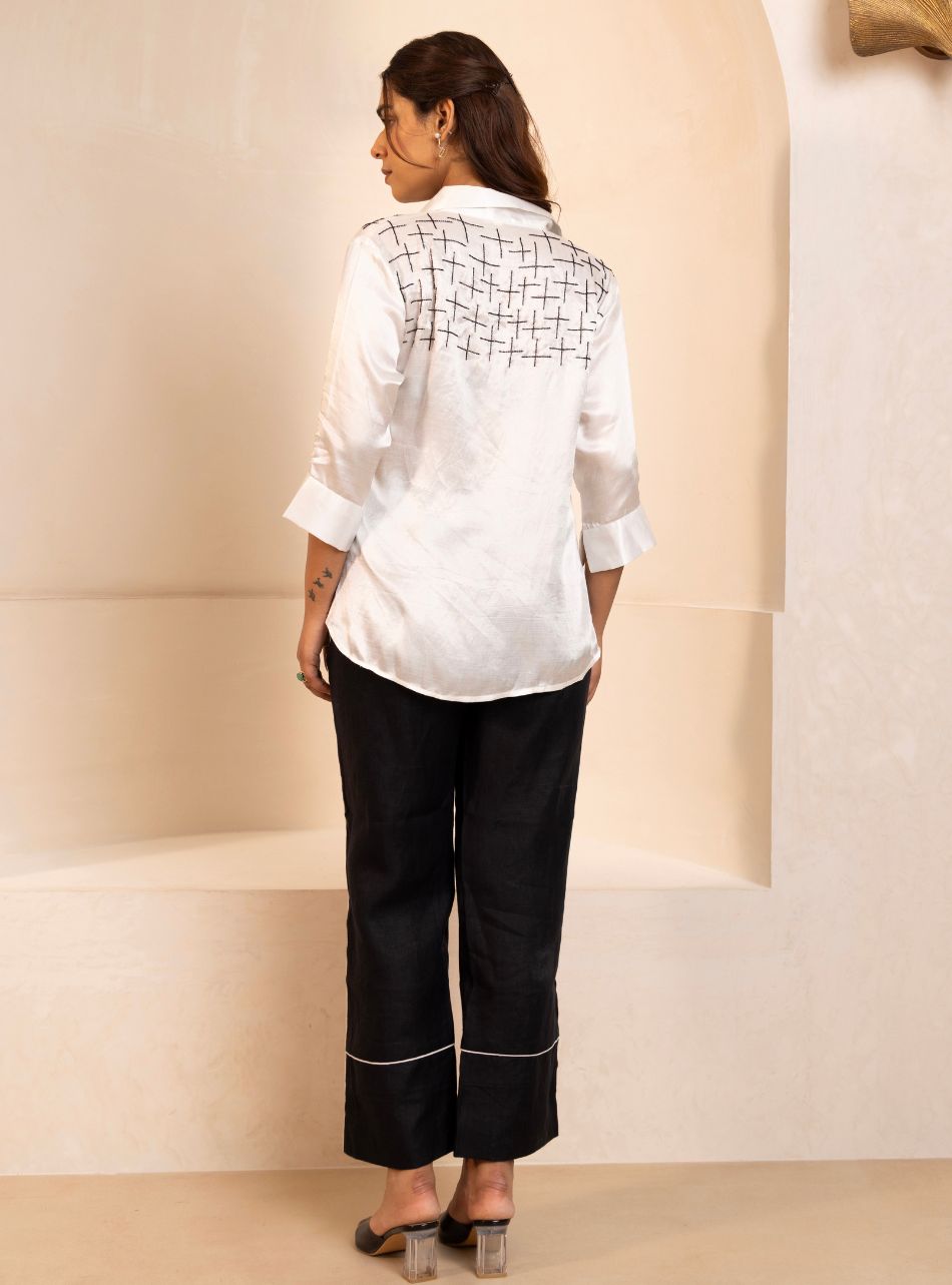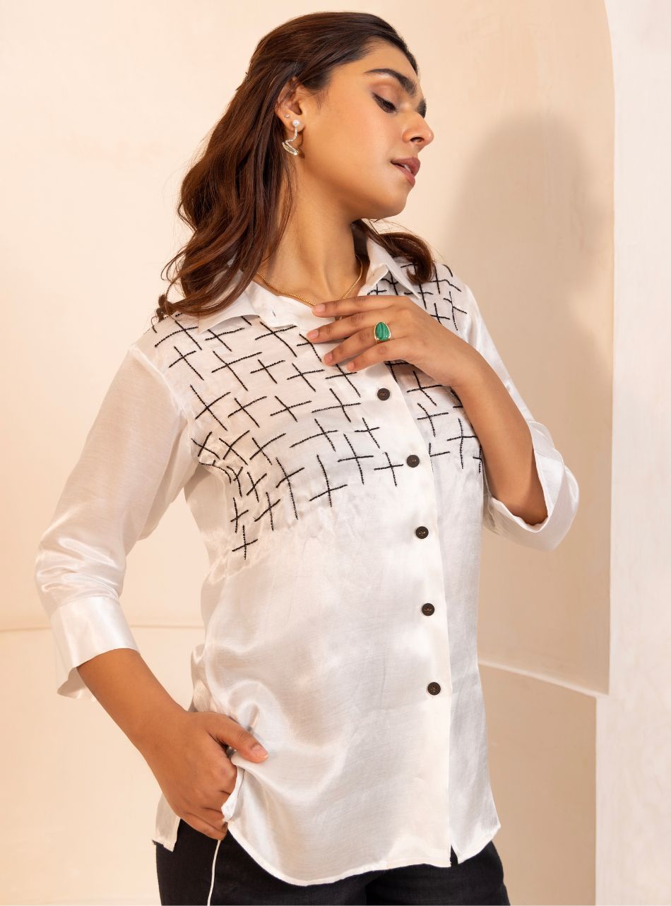 A minimal embroidered silk shirt in white colour, combines luxury with elegance, perfect for adding a touch of sophistication to any outfit. A slightly loose shirt with straight sleeves and cuffs, with the use of Katdana on the shoulder front and back.