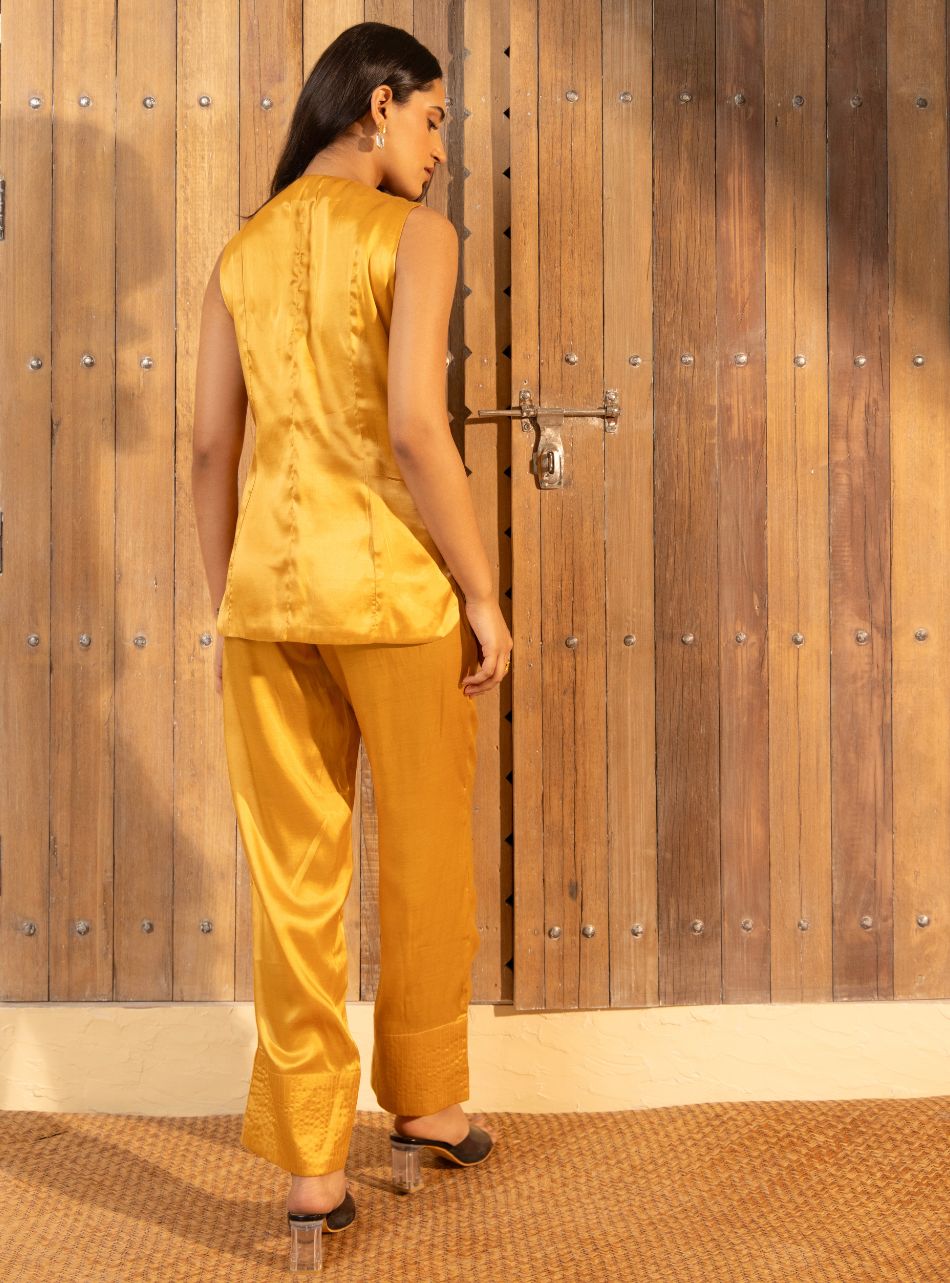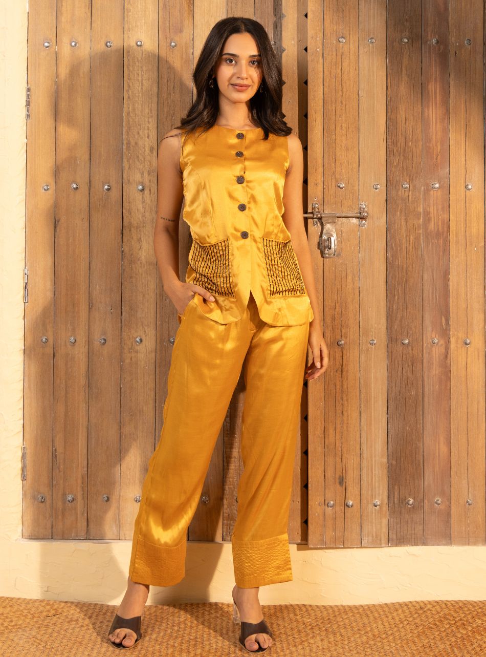 A fantasy escape form the everyday. The top has a powerful paneled silhouette with scooped hem and side slits , perfectly paired with tapered fit pants for a clean and versatile look. Whether worn for special occasions, festive celebrations, or everyday wear, this vibrant outfit is sure to make a statement and turn heads wherever you go.