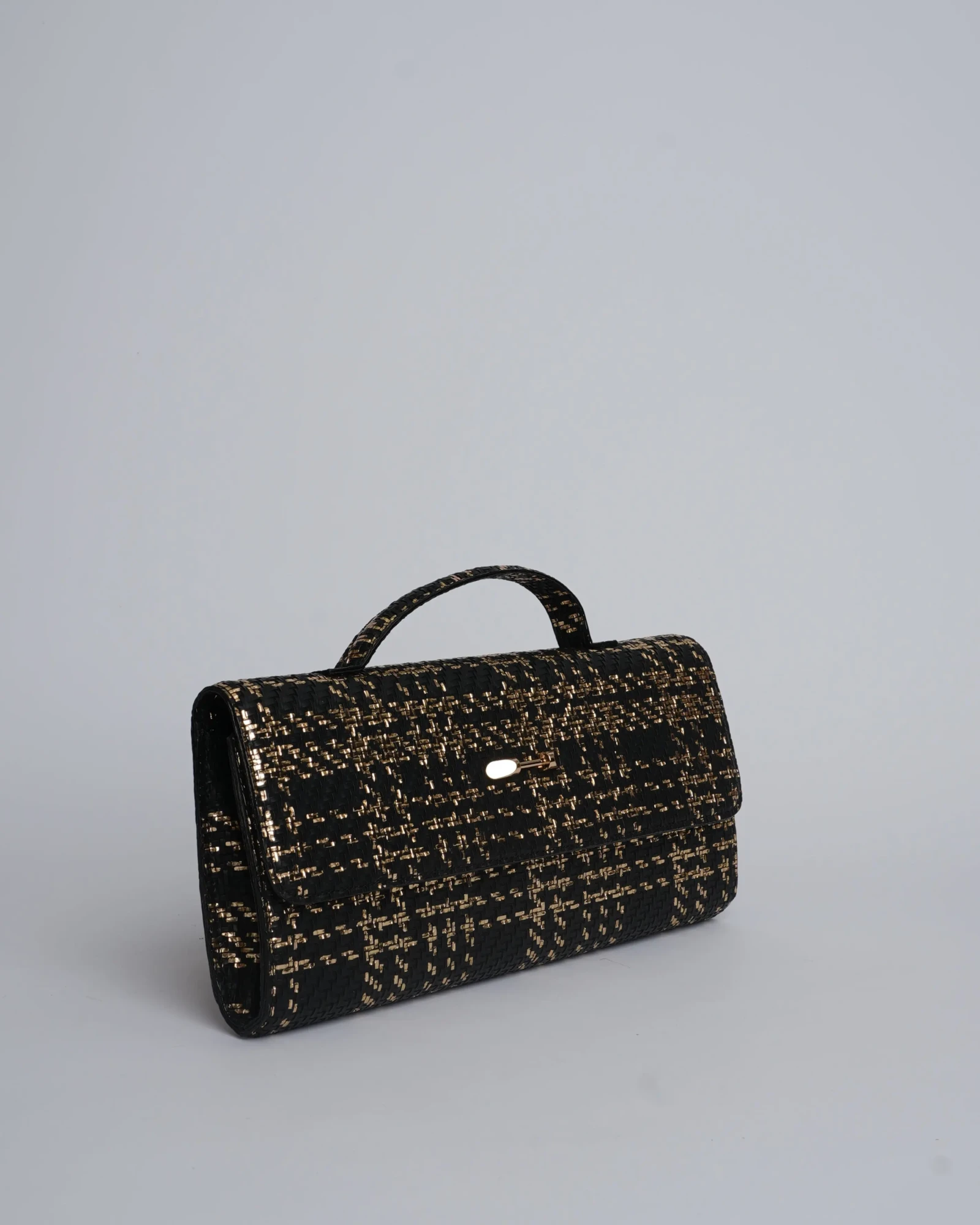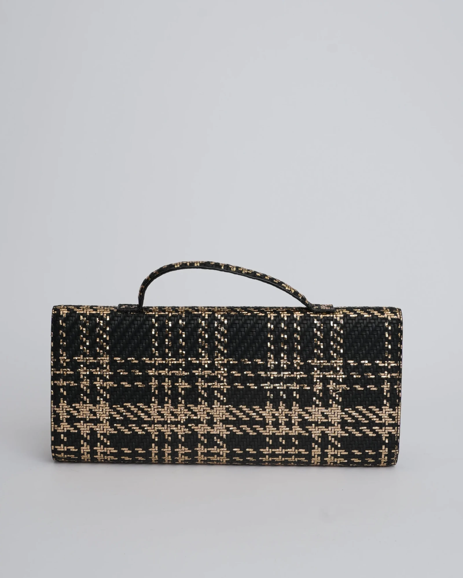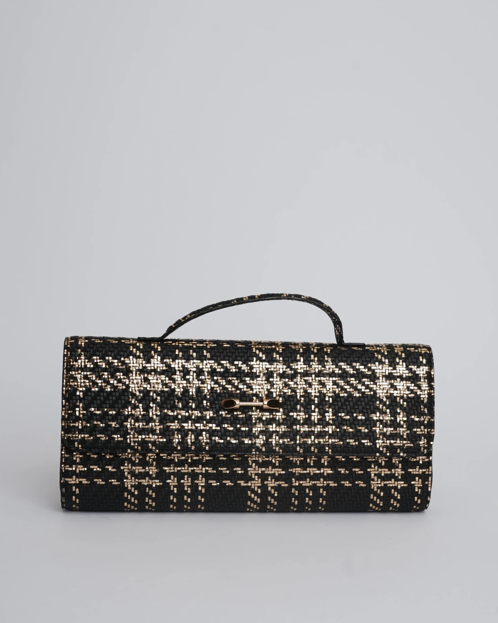 The chic rectangular Extensa is created in textured faux leather. This elongated clutch design comes with a short handle and an adjustable long strap with a mini buckle.