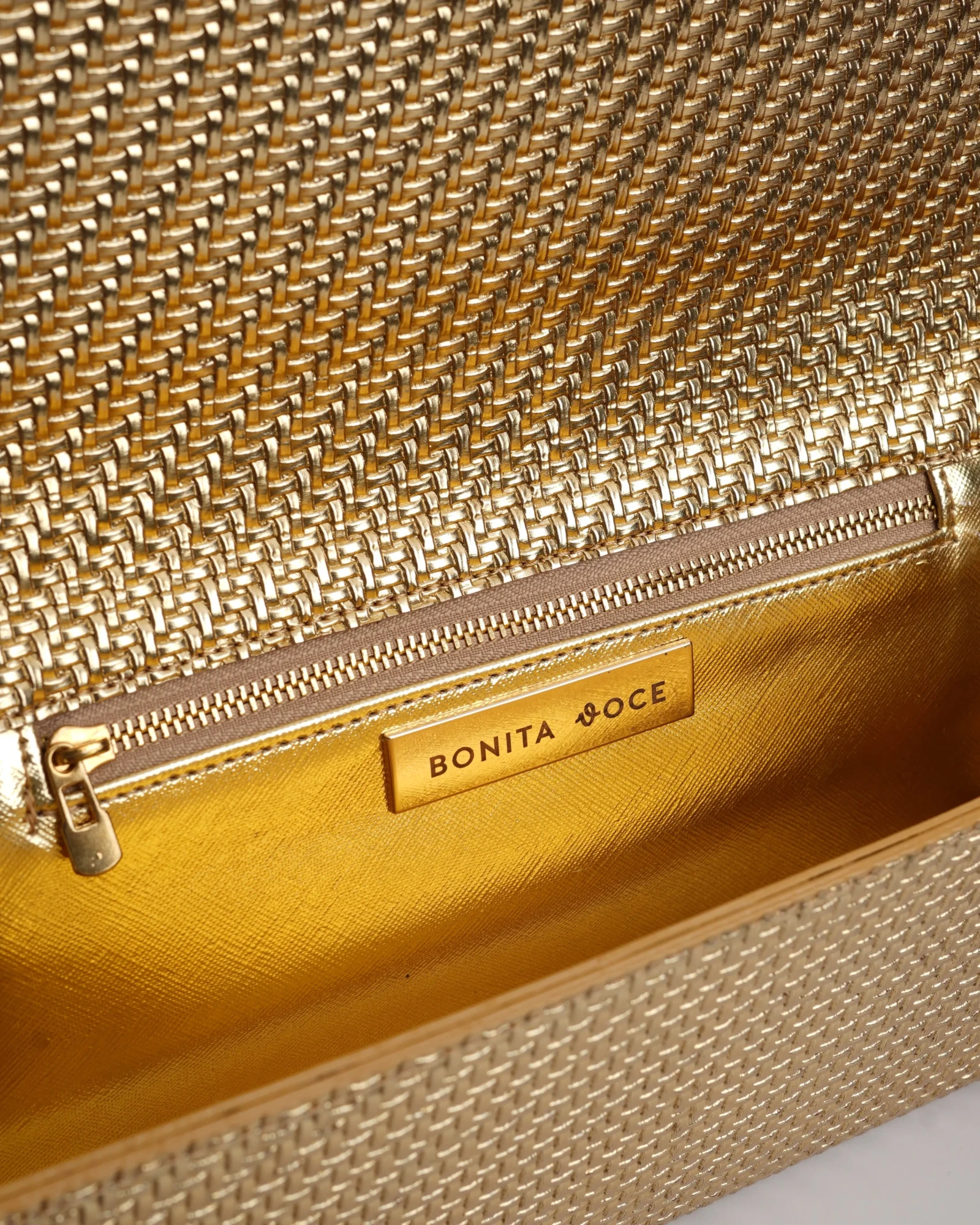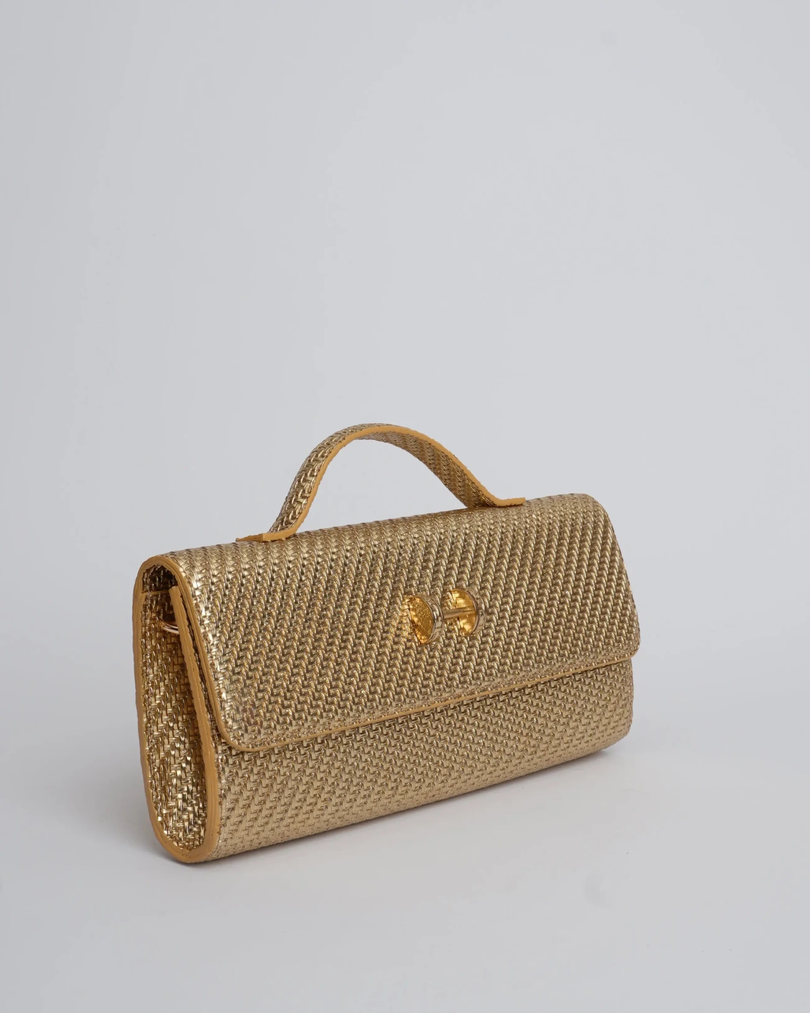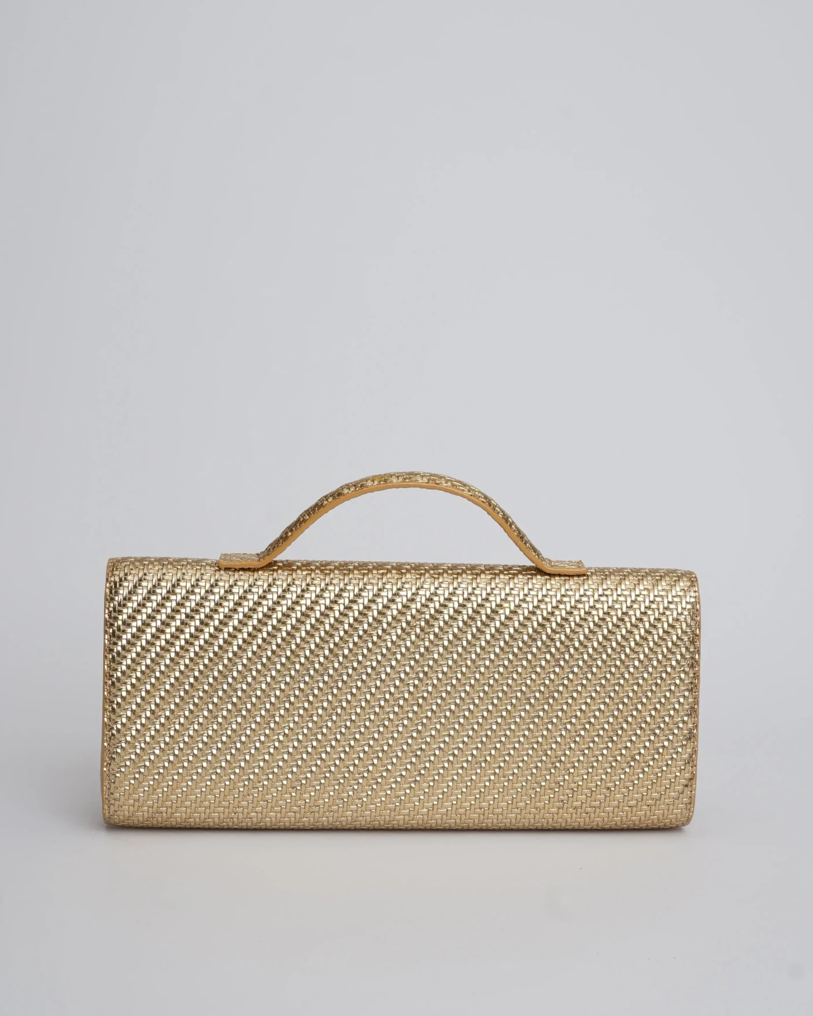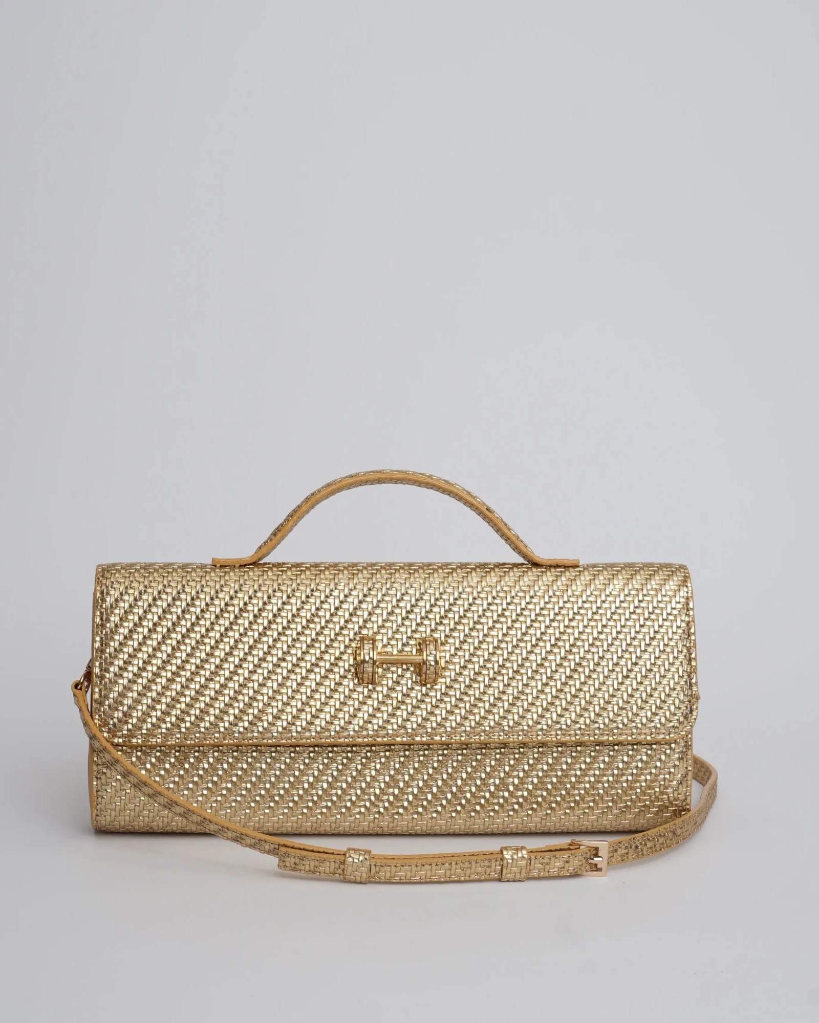 The chic rectangular Extensa is created in textured faux leather. This elongated clutch design comes with a short handle and an adjustable long strap with a mini buckle.
