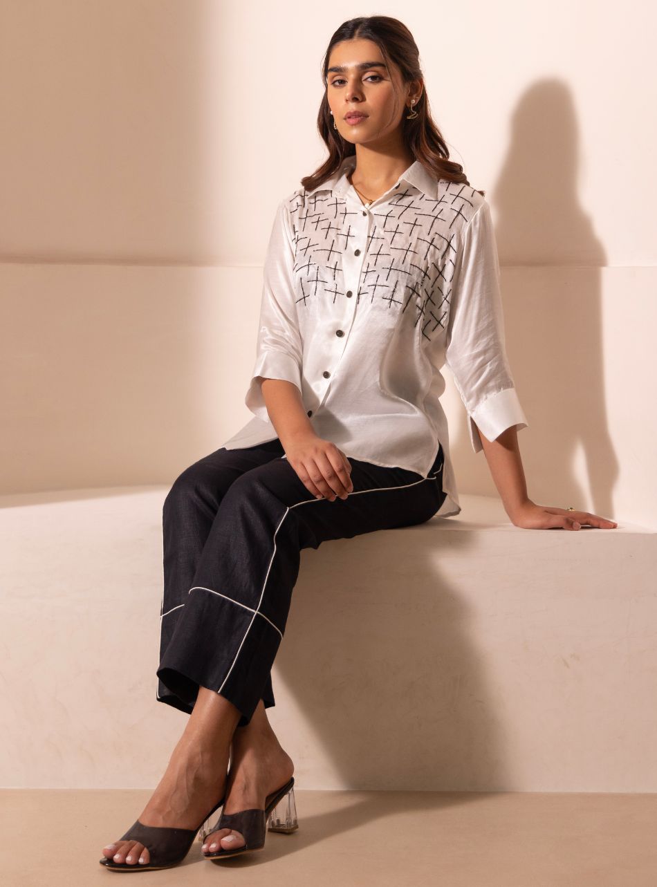 A set of minimal embroidered Crystal shirt with Petra pants creates a stylish ensemble that blends luxury & sophistication with sustainability. This set is versatile enough to take you from casual daytime outings to more formal occasions with ease. On Shirt, we have used the katdana hand embroidey on the shoulder front and back with 3/4 sleeves with a relaxed silhouette paired with a straight fit pants with back elastic for adjustability.