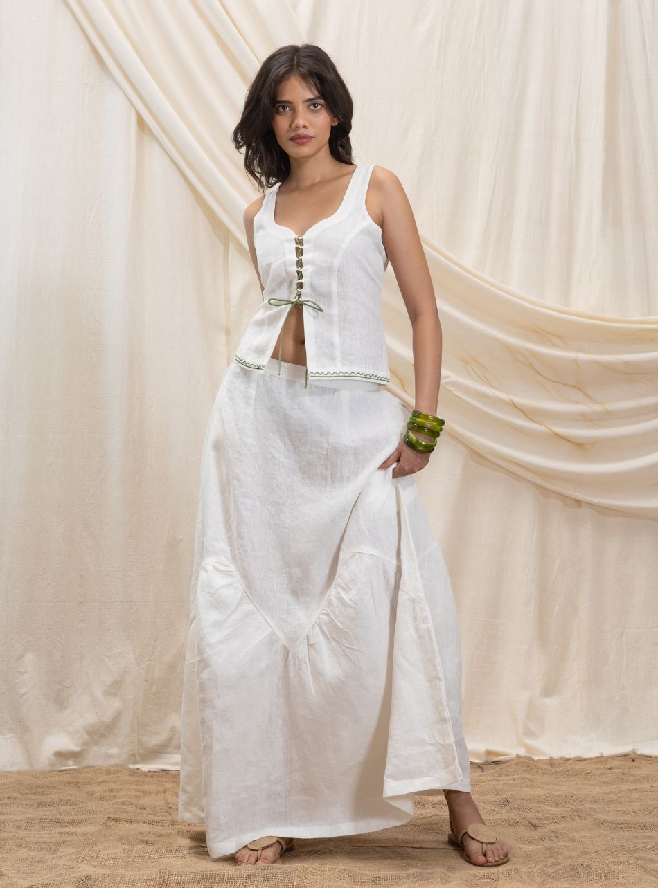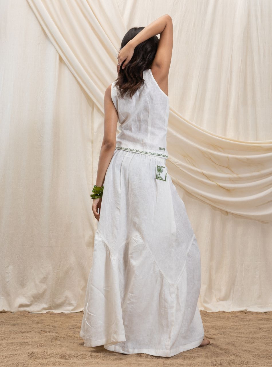 This halter neck top features a smocked back for a flattering fit and a secure button fastening at the neck. The V-cut hemline accentuates the waist, adding a structured yet effortless silhouette. The neckline is adorned with our signature line embroidery in a contrasting color, enhancing the overall design with a subtle yet striking detail.