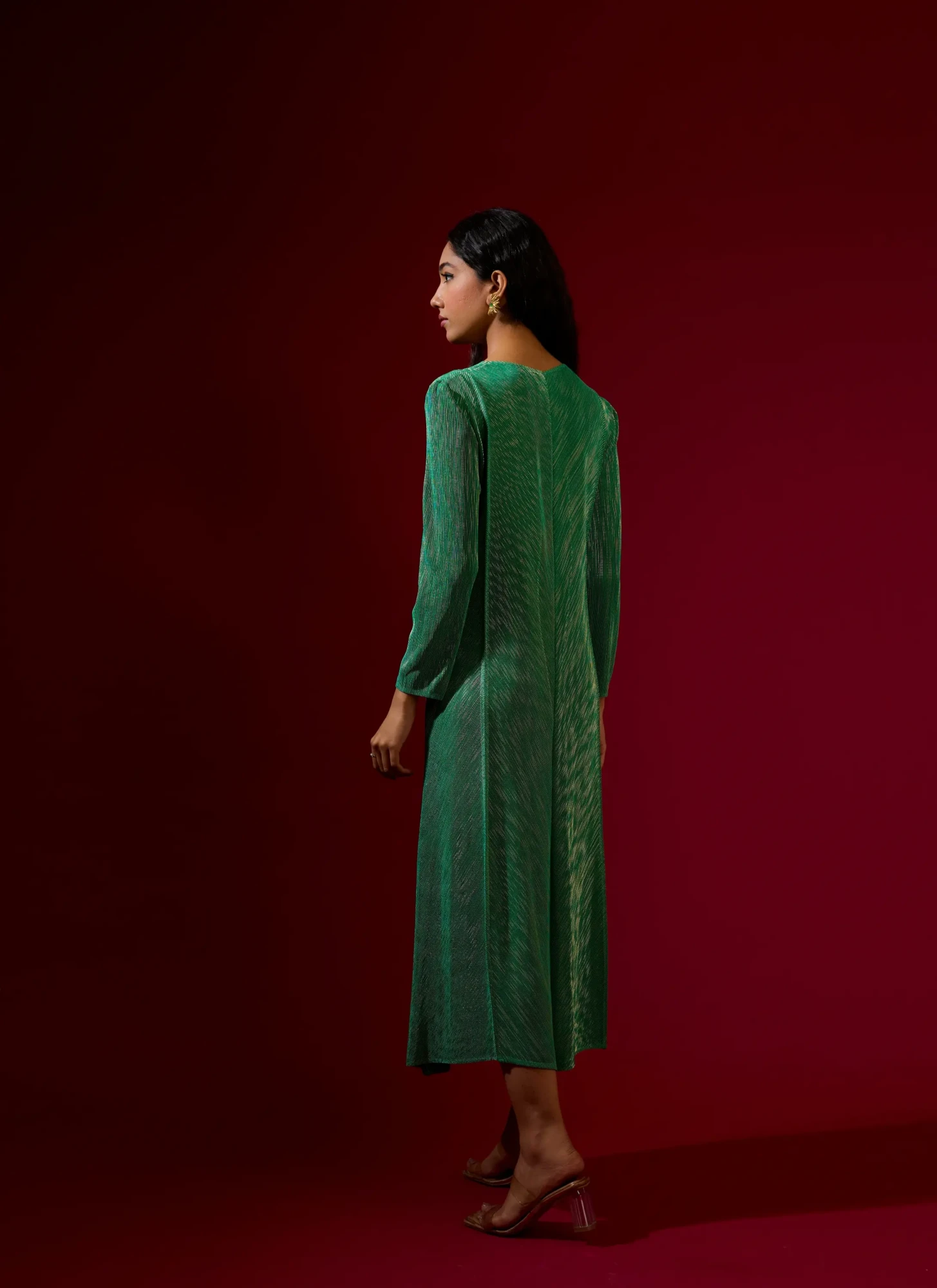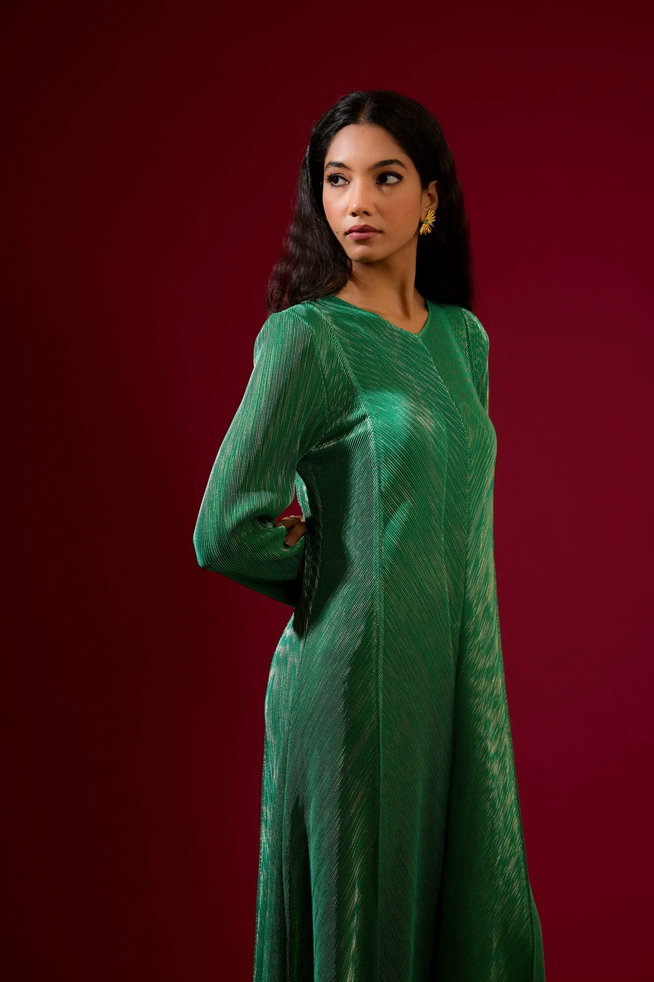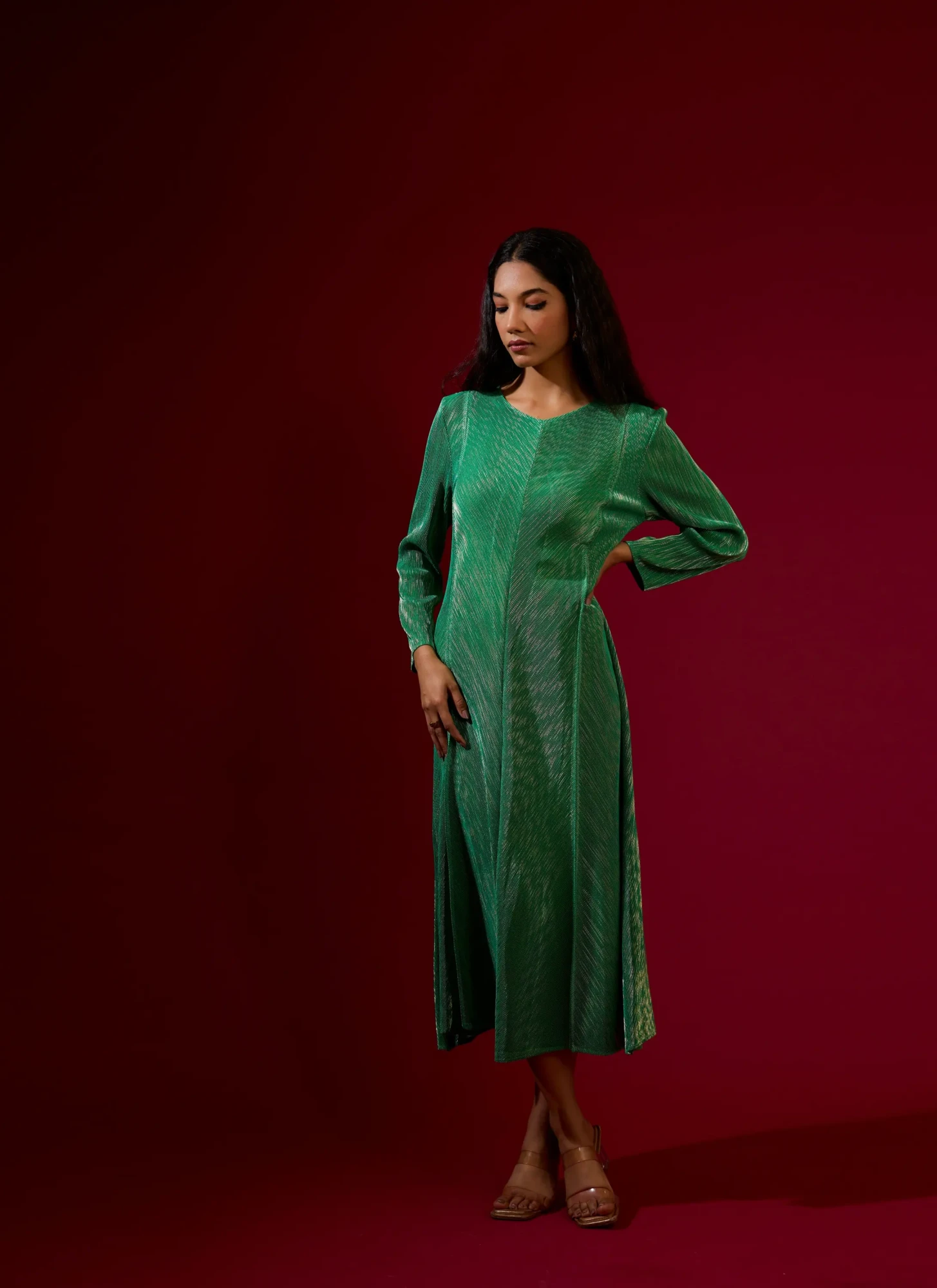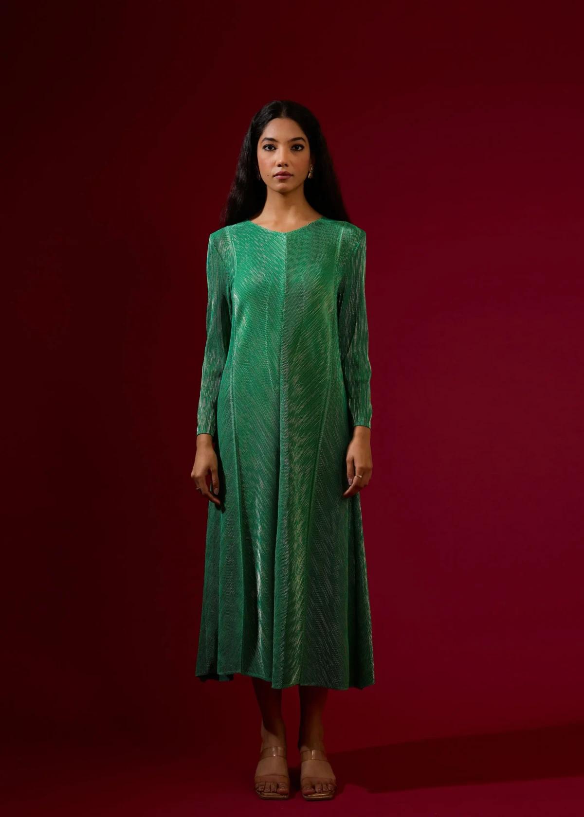 Metallic Finish Green A-Line Princess Cut Long Dress. The slimming silhouette accentuates the waist at just the right place. (Fits from S to XXL)