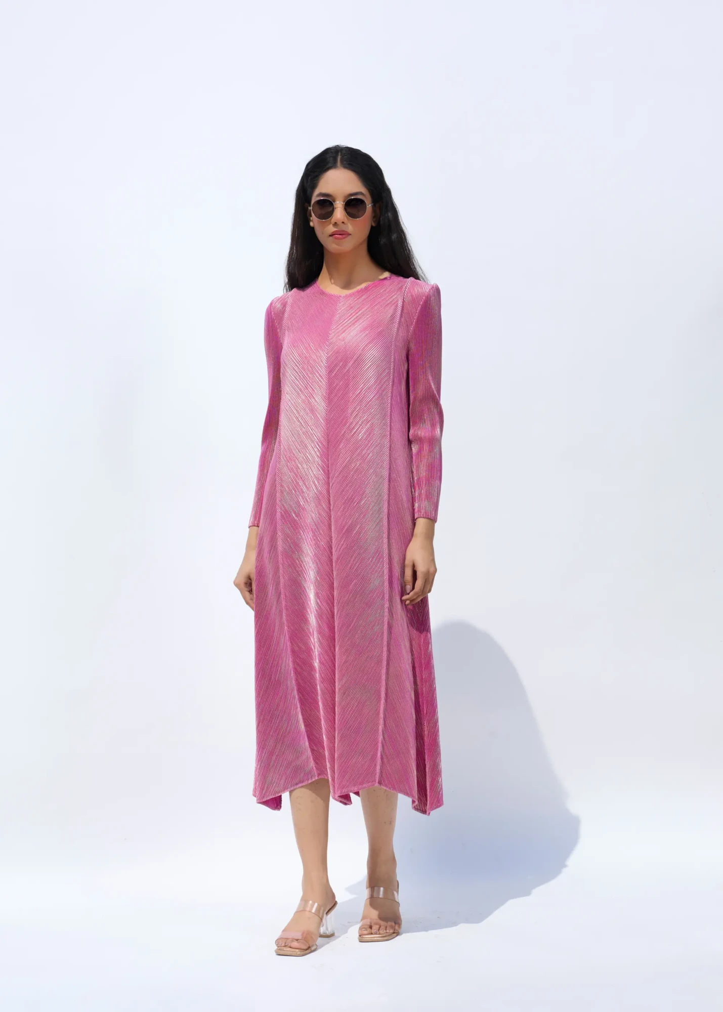 Introducing Metallic Finish Pink A-Line Princess Cut Long Dress. The slimming silhouette accentuates the waist at just the right place. Its sleek design makes it a must-have for anyone’s wardrobe. (Fits from S to XXL)