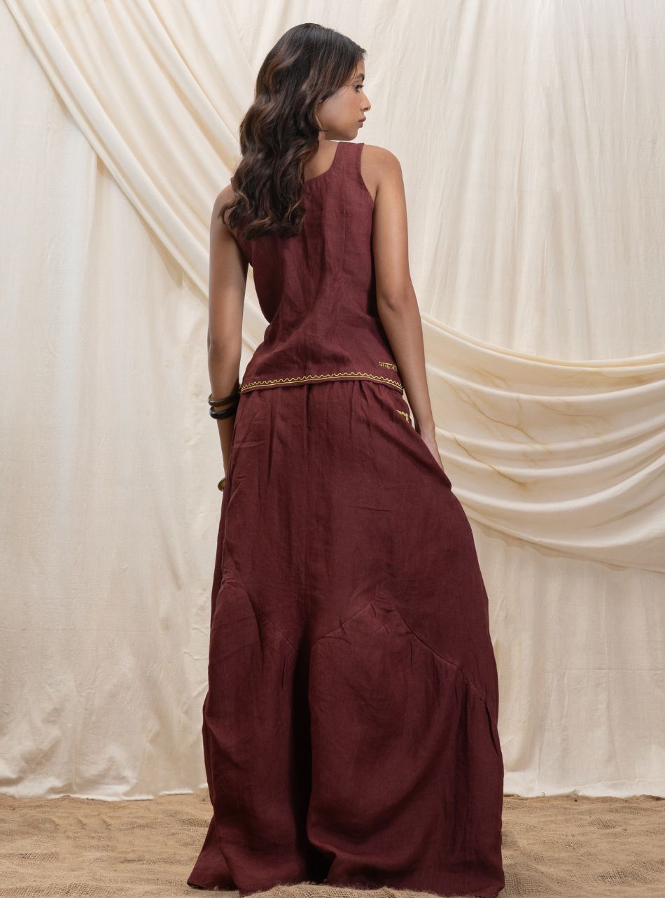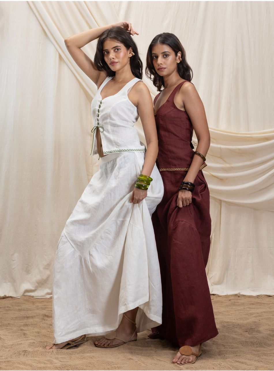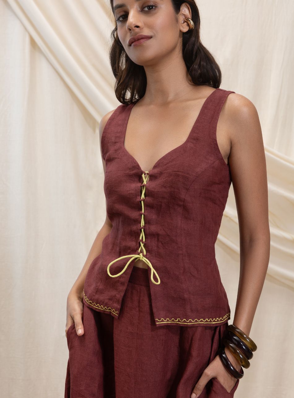 A well-fitted, sleeveless corset-style top with a flattering silhouette, featuring a drawstring fastening at the center in a contrasting color that adds both charm and edge. The hem is finished with our signature line embroidery in a contrasting shade, adding refined detail. At the back, the Akashi logo in Hindi is subtly embroidered, giving the top its unique identity.