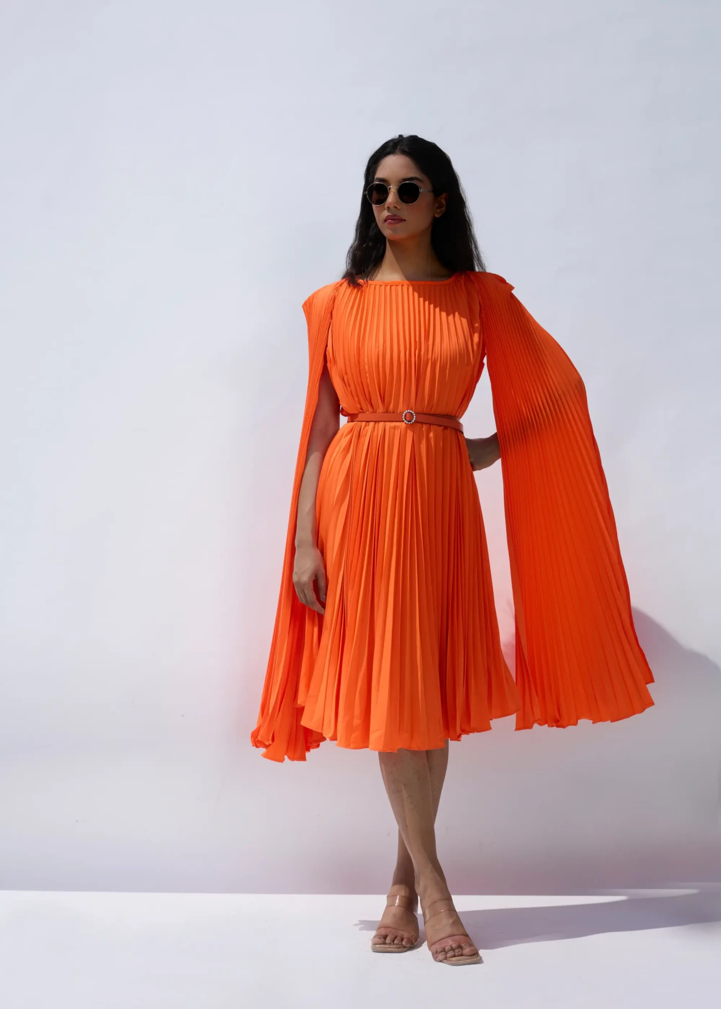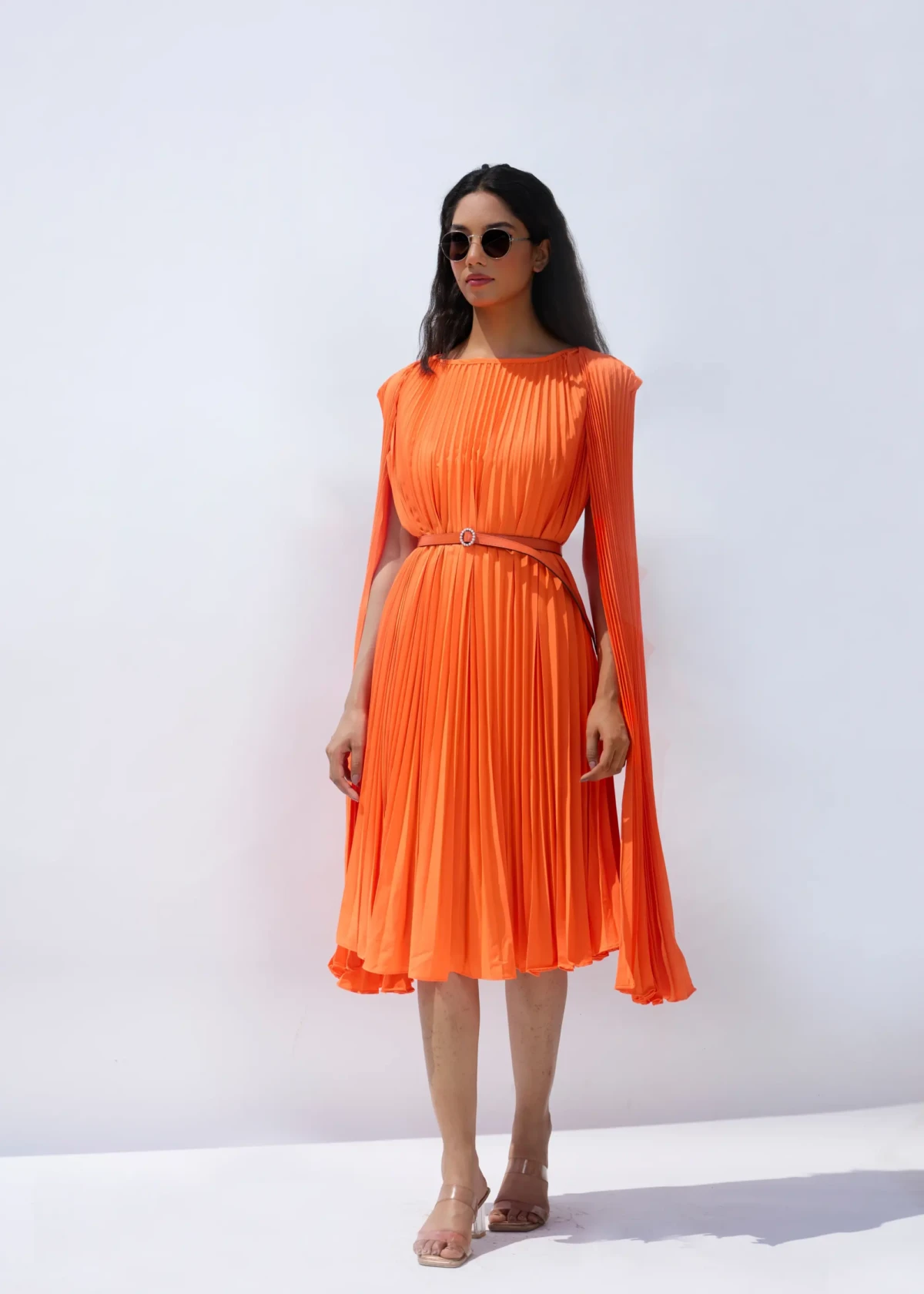 Introducing our Lulu Cloak Sleeve Dress in orange, featuring a Pleated Boast Neck design with elegant Cloak sleeves. Complete the look with our included belt for added flair.. (Fits from S to XL)