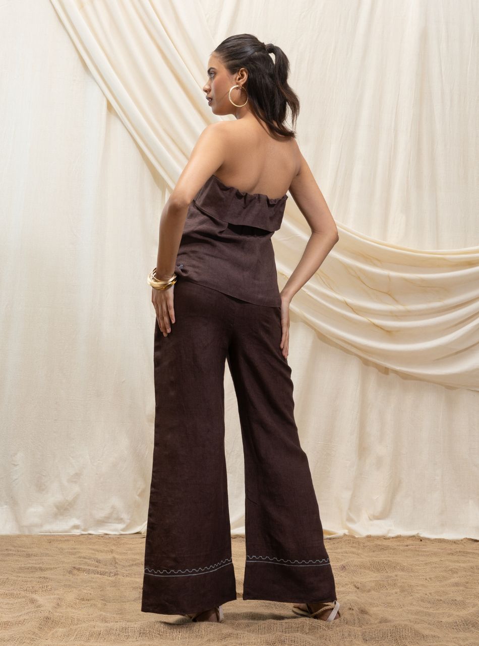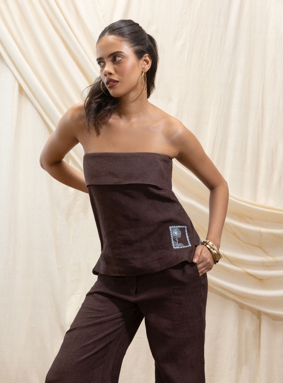 A structured tube top featuring an elegant overlay at the chest, with concealed elastic at the back and a side zip closure to ensure a secure and flattering fit. The side slits offer ease and movement, while the Akashi logo in Hindi and our signature stamp are embroidered in a contrasting color, adding identity and charm to the minimalist silhouette.