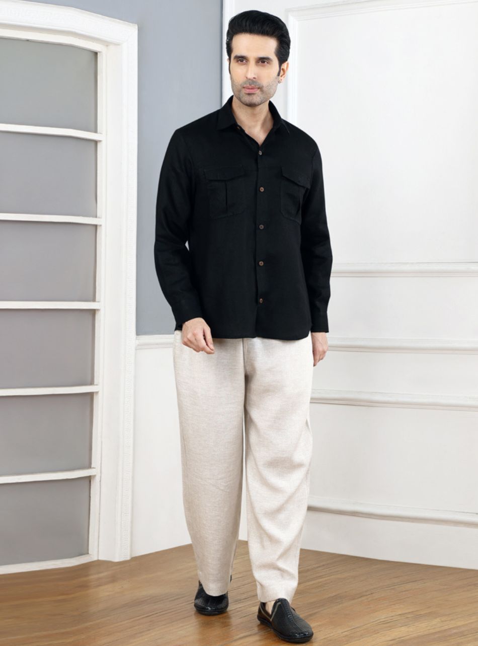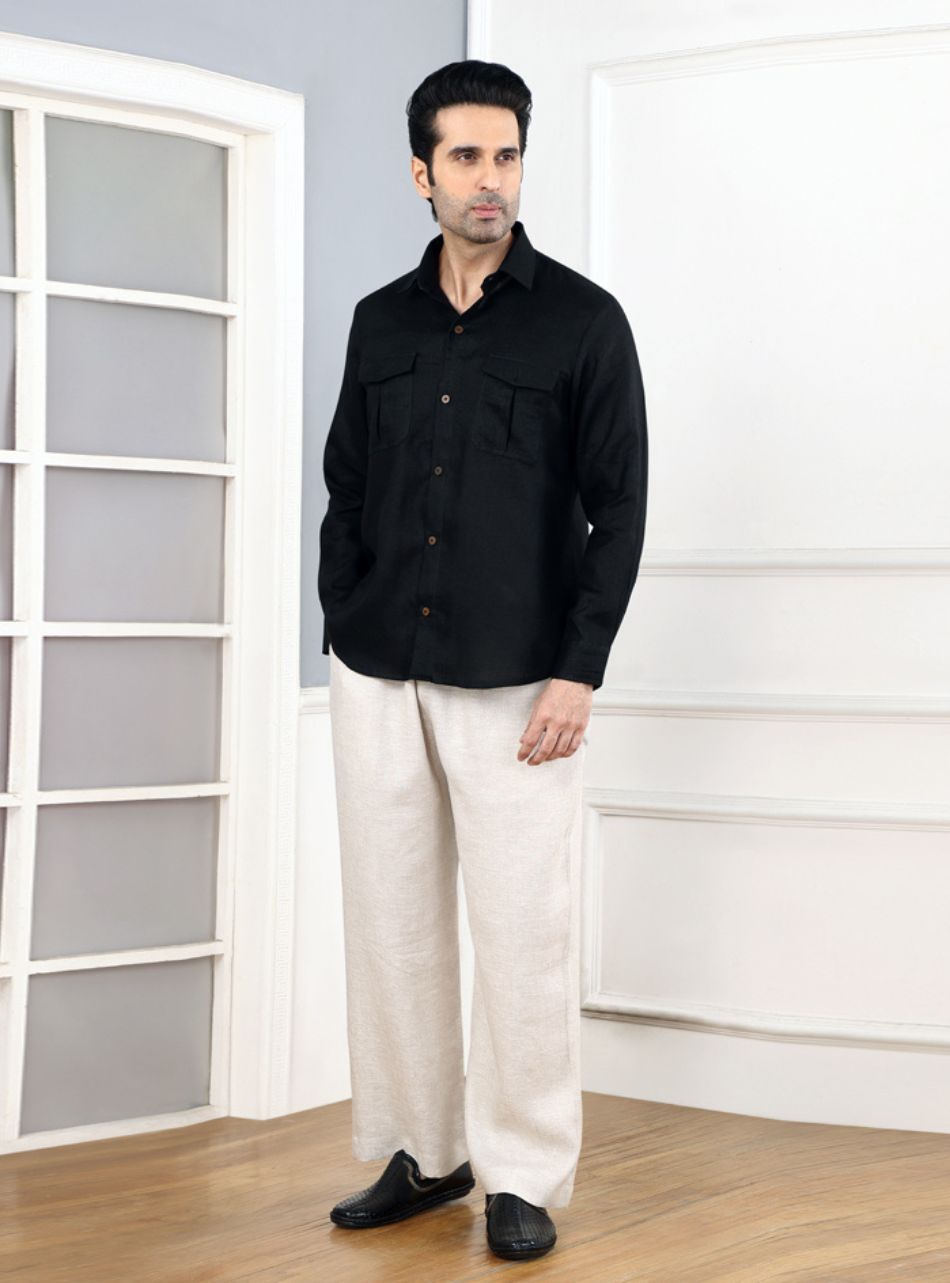 Make a statement with our Men’s Pitch Black Pure Linen Pocket Full Sleeves Shirt. Crafted from 100% pure linen, this shirt exudes sophistication and comfort.