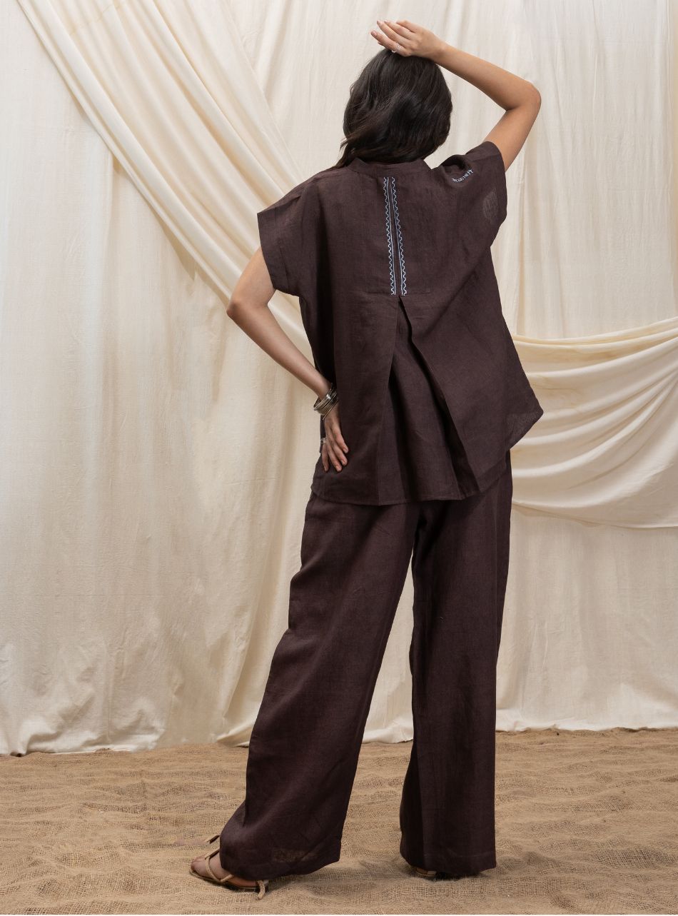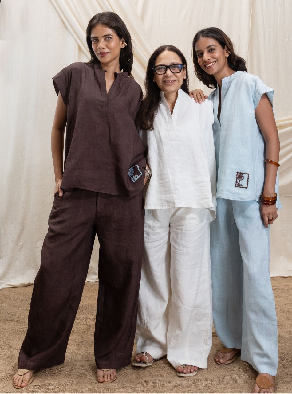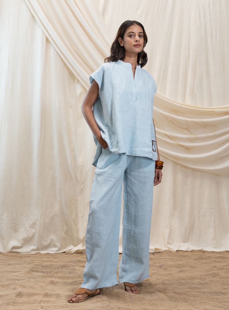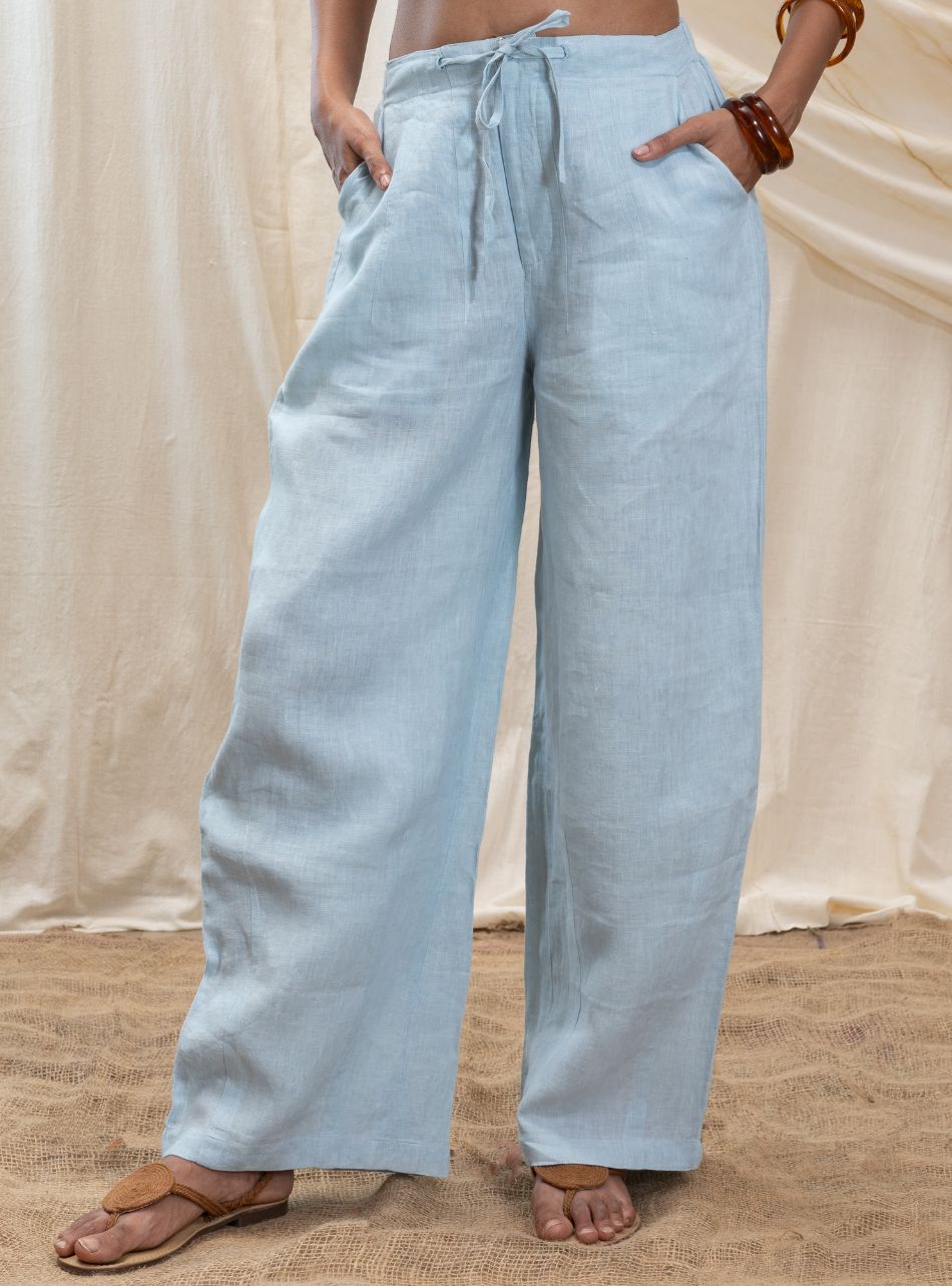 Easy-fit drawstring pants with a hook, button, and zip fastening for security and ease. The back features an elasticated waistband for added comfort, while pockets on either side provide functionality. The slightly flared bottom and relaxed fit give these pants an effortless, laid-back vibe.