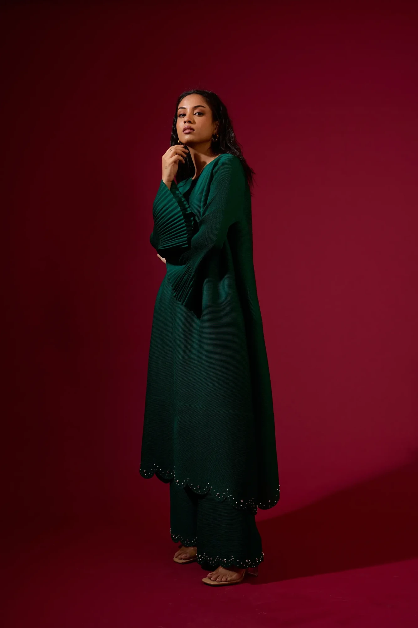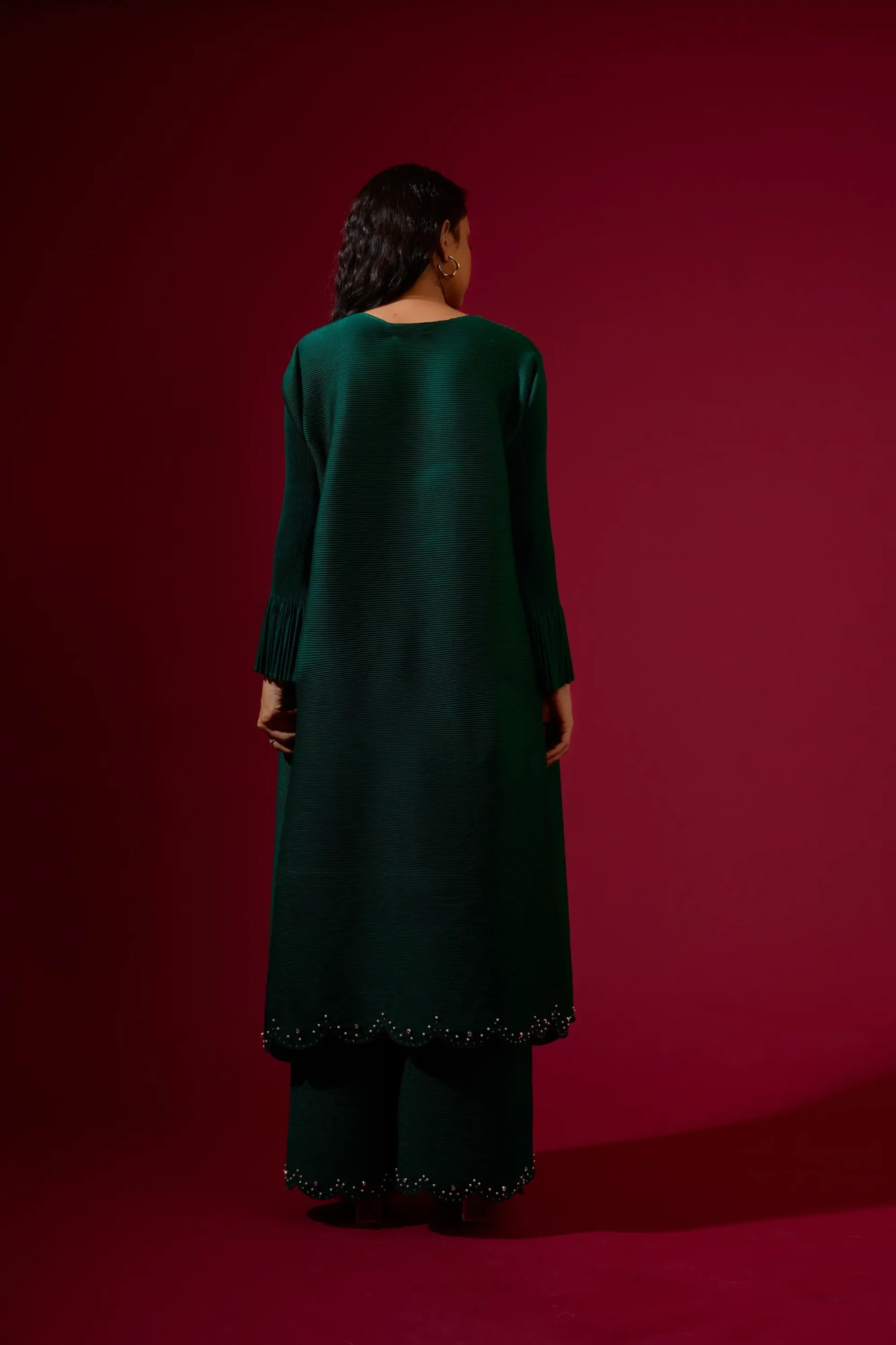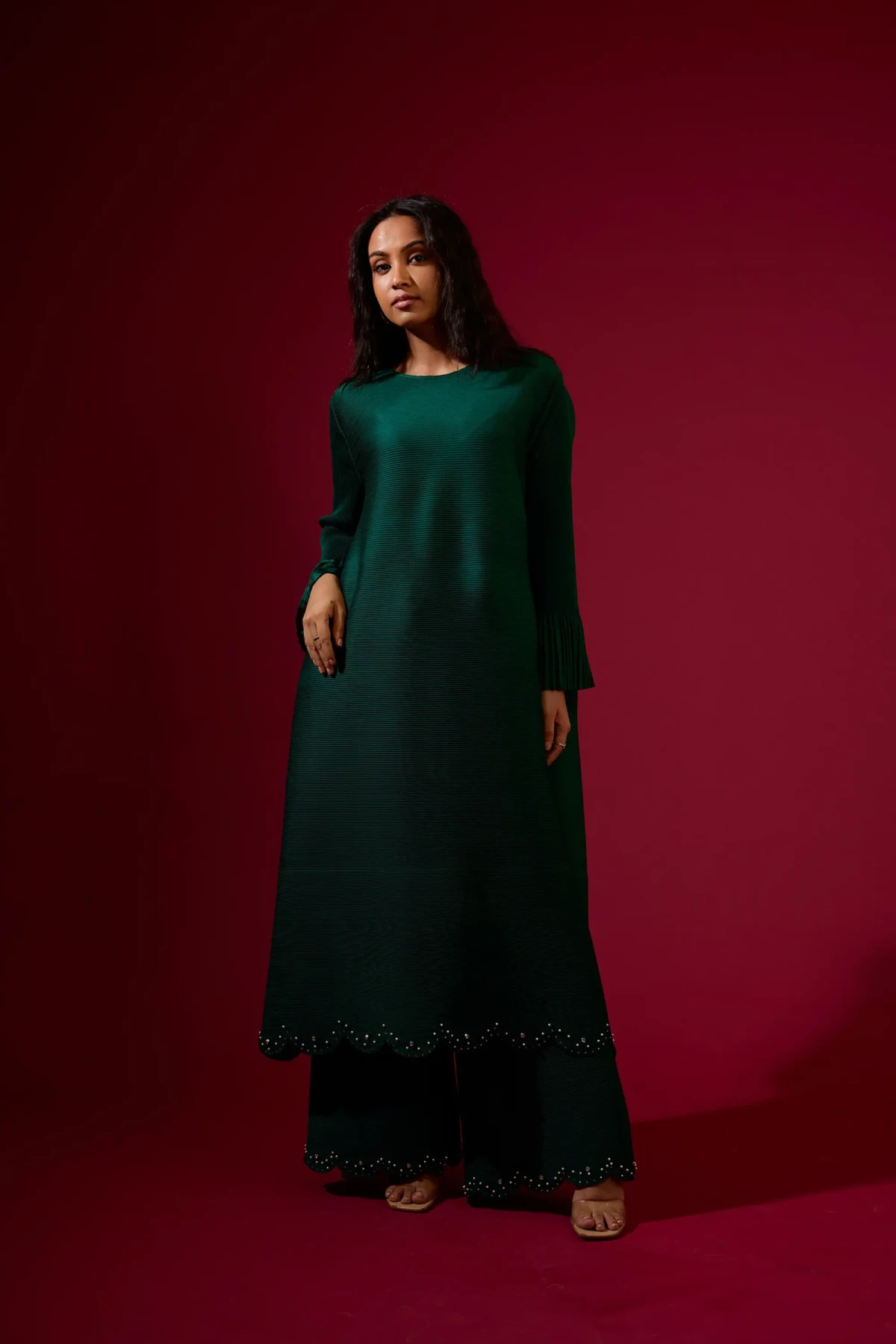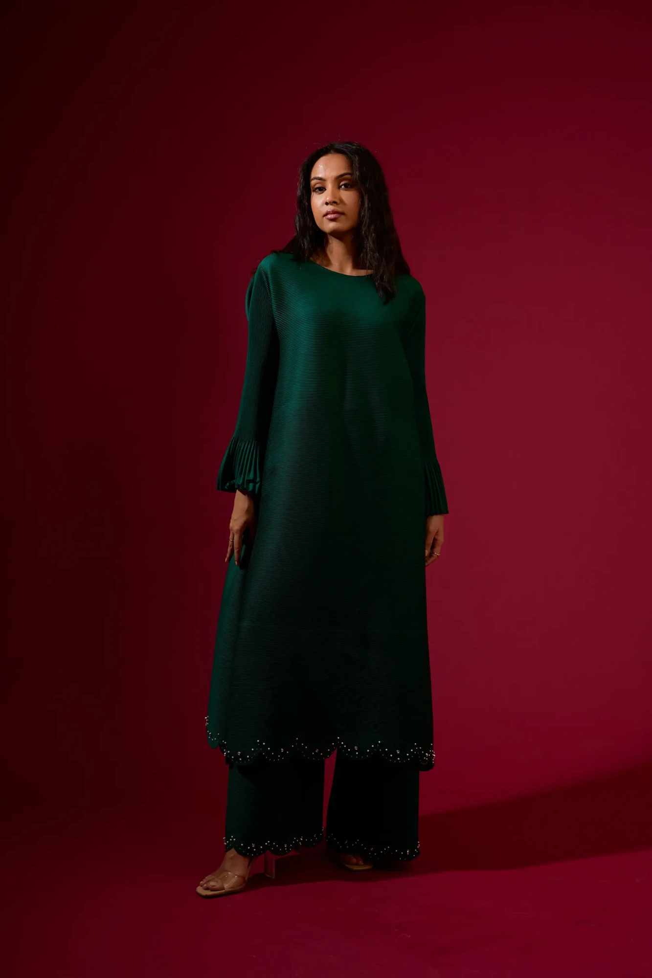 A statement Coord set, featuring embellished scallop hem at Tunic and pants both and bell sleeves. (Fits from S to XXL)