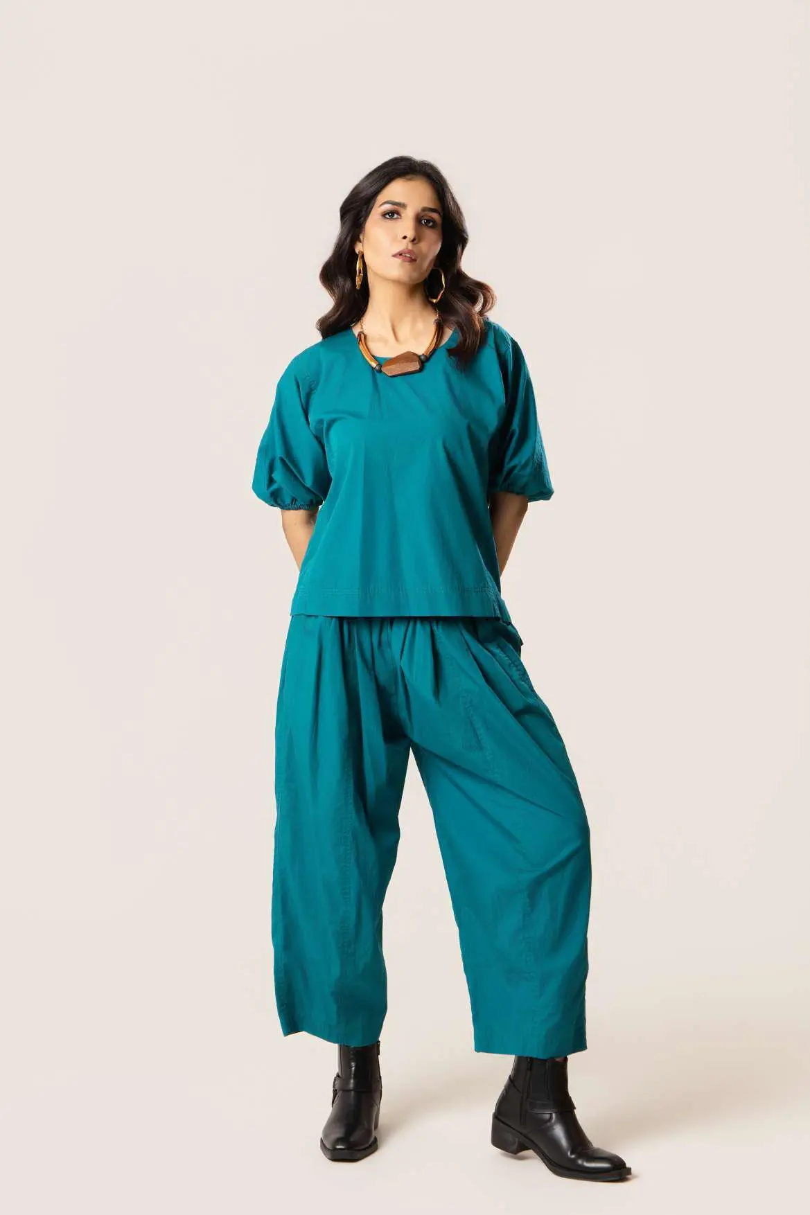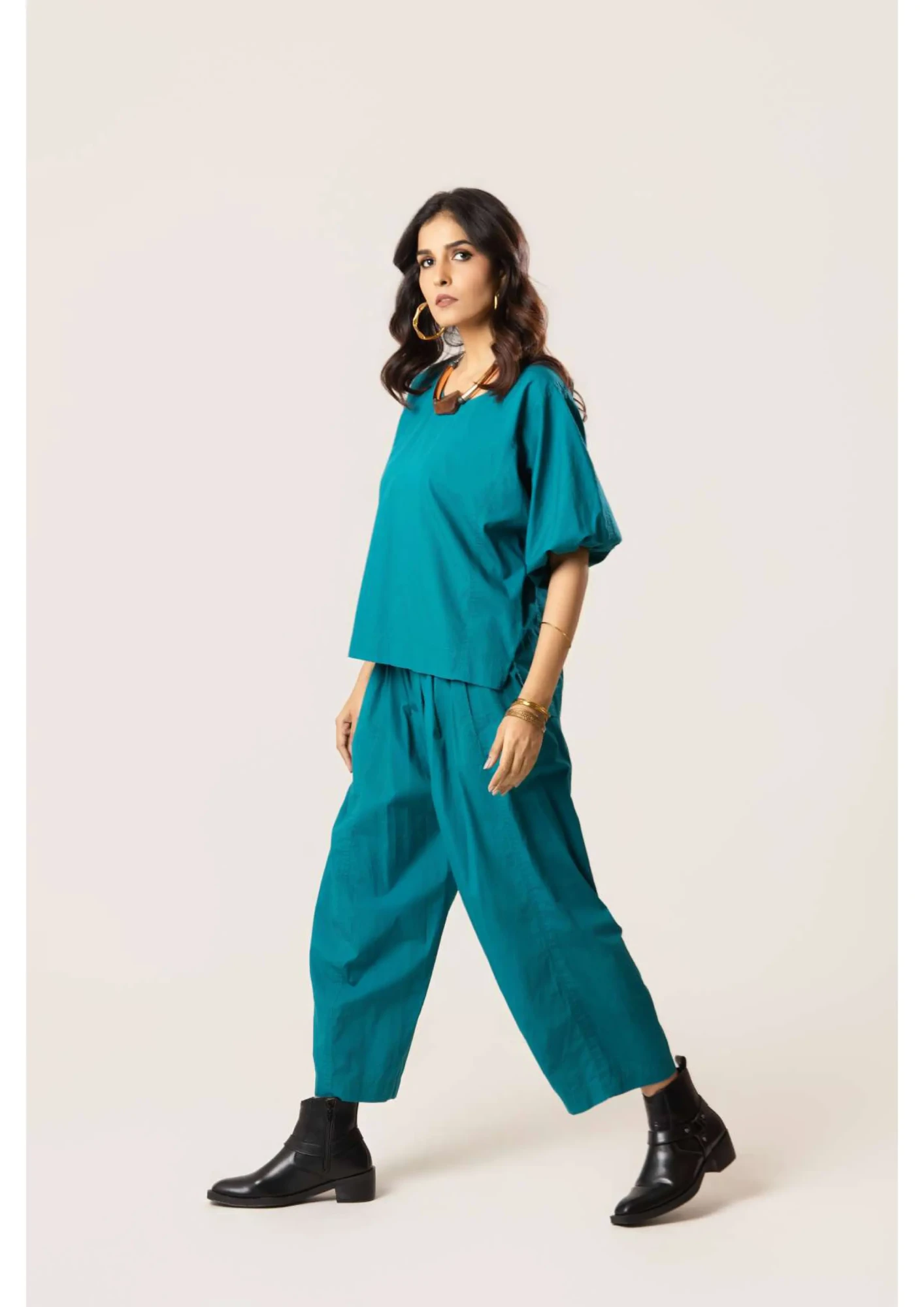 100% Cotton Poplin – Premium Cotton. Short anti fit high-low top with short sleeves. Relaxed fit patiyala style pant with all over double stitching.