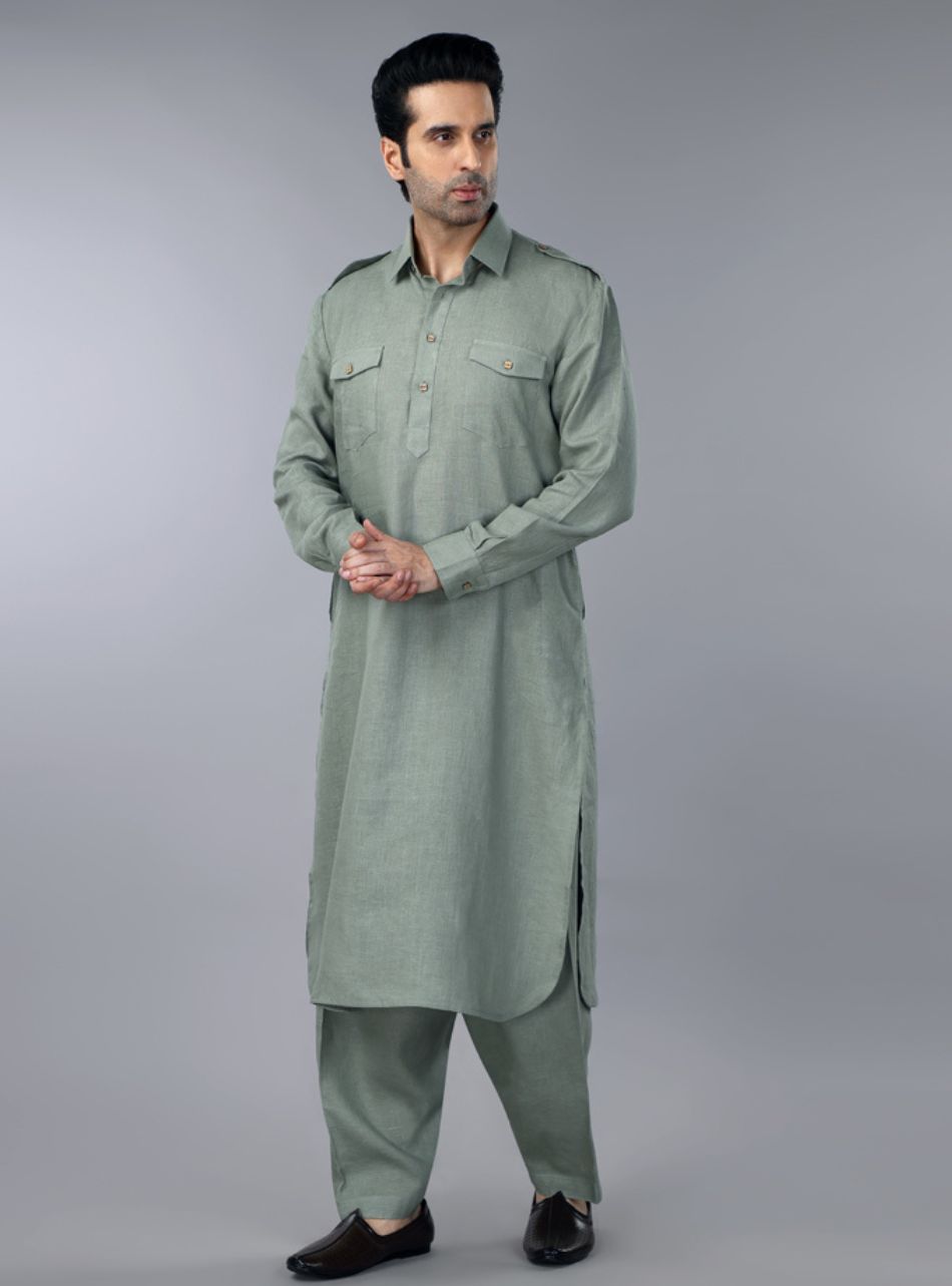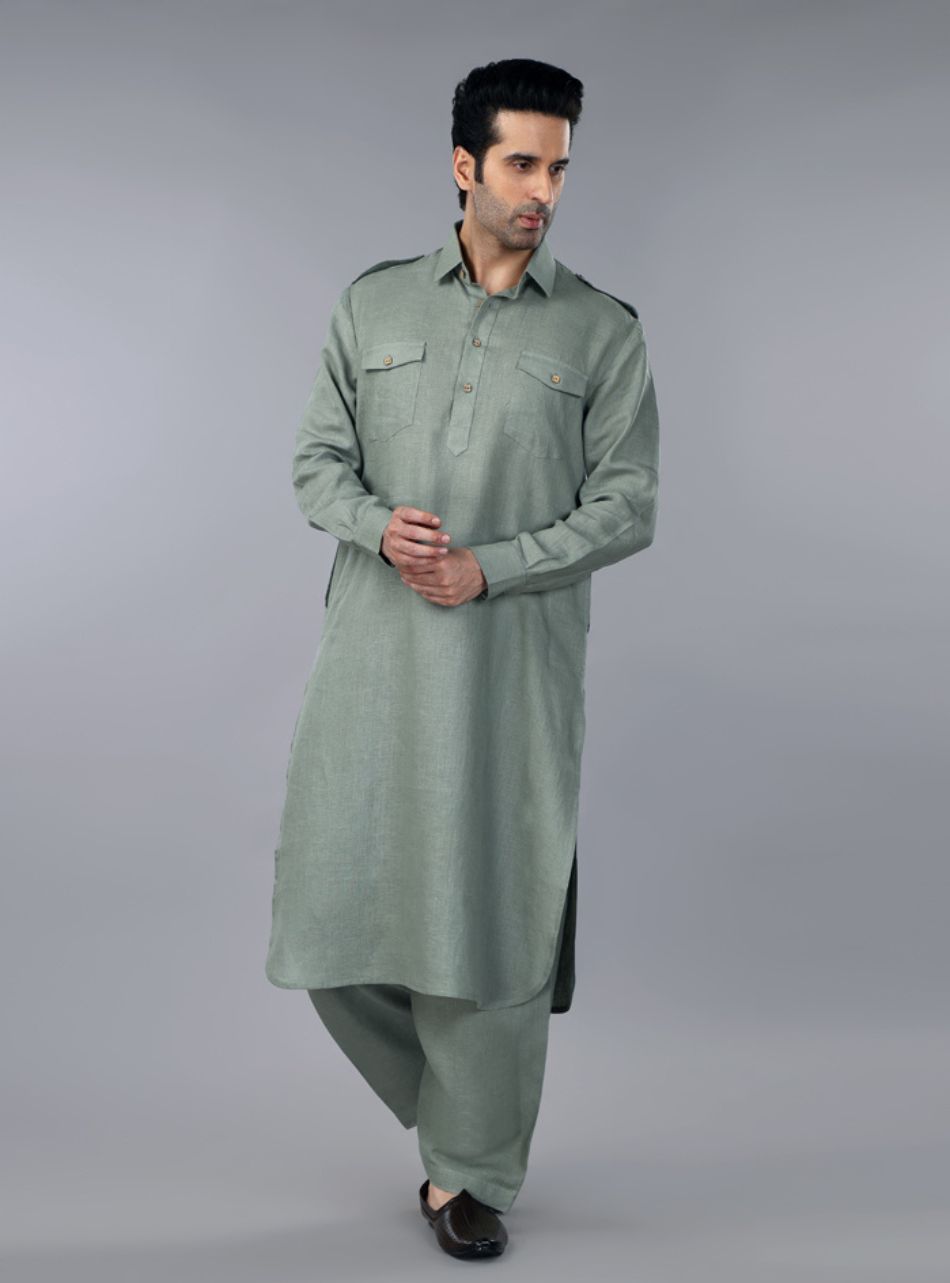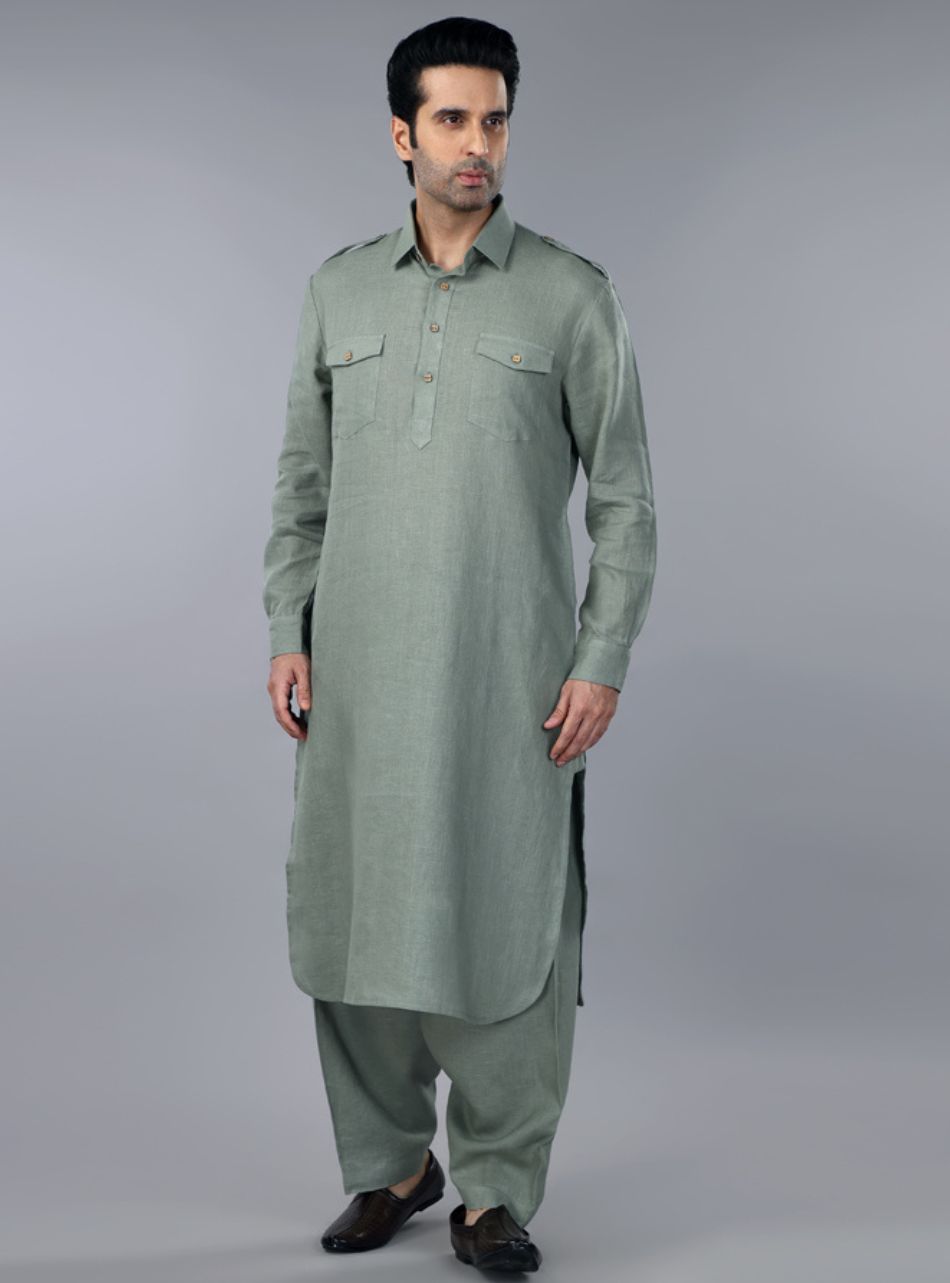 Sage Green Linen Pathani Suit