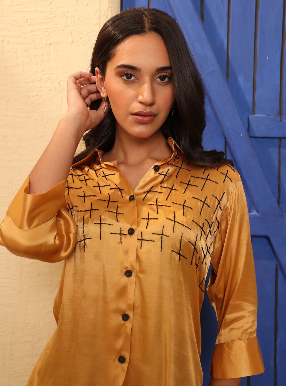 A minimal embroidered silk shirt in golden colour, combines luxury with elegance, perfect for adding a touch of sophistication to any outfit. A slightly loose shirt with straight sleeves and cuffs, with the use of Katdana on the shoulder front and back.