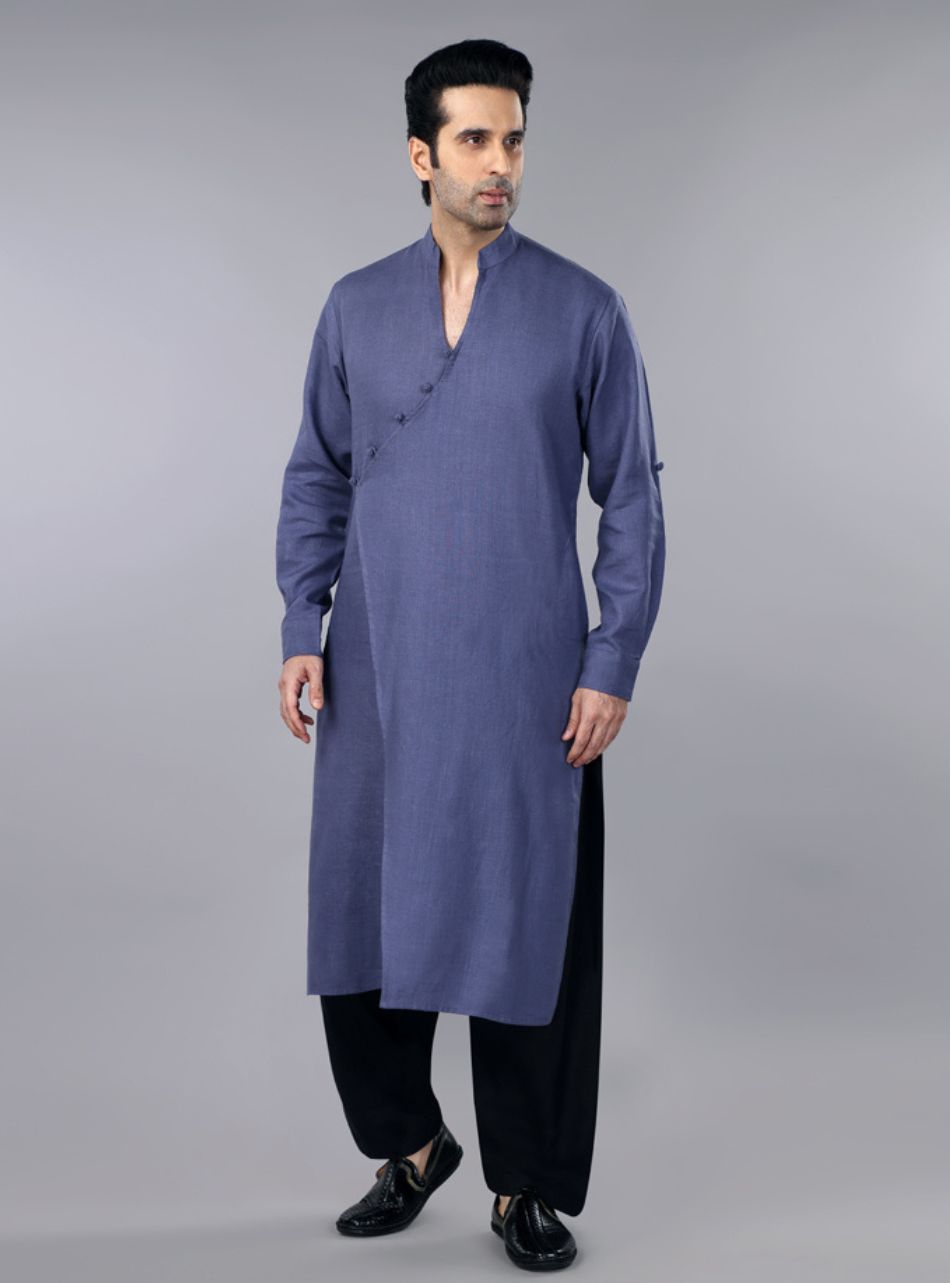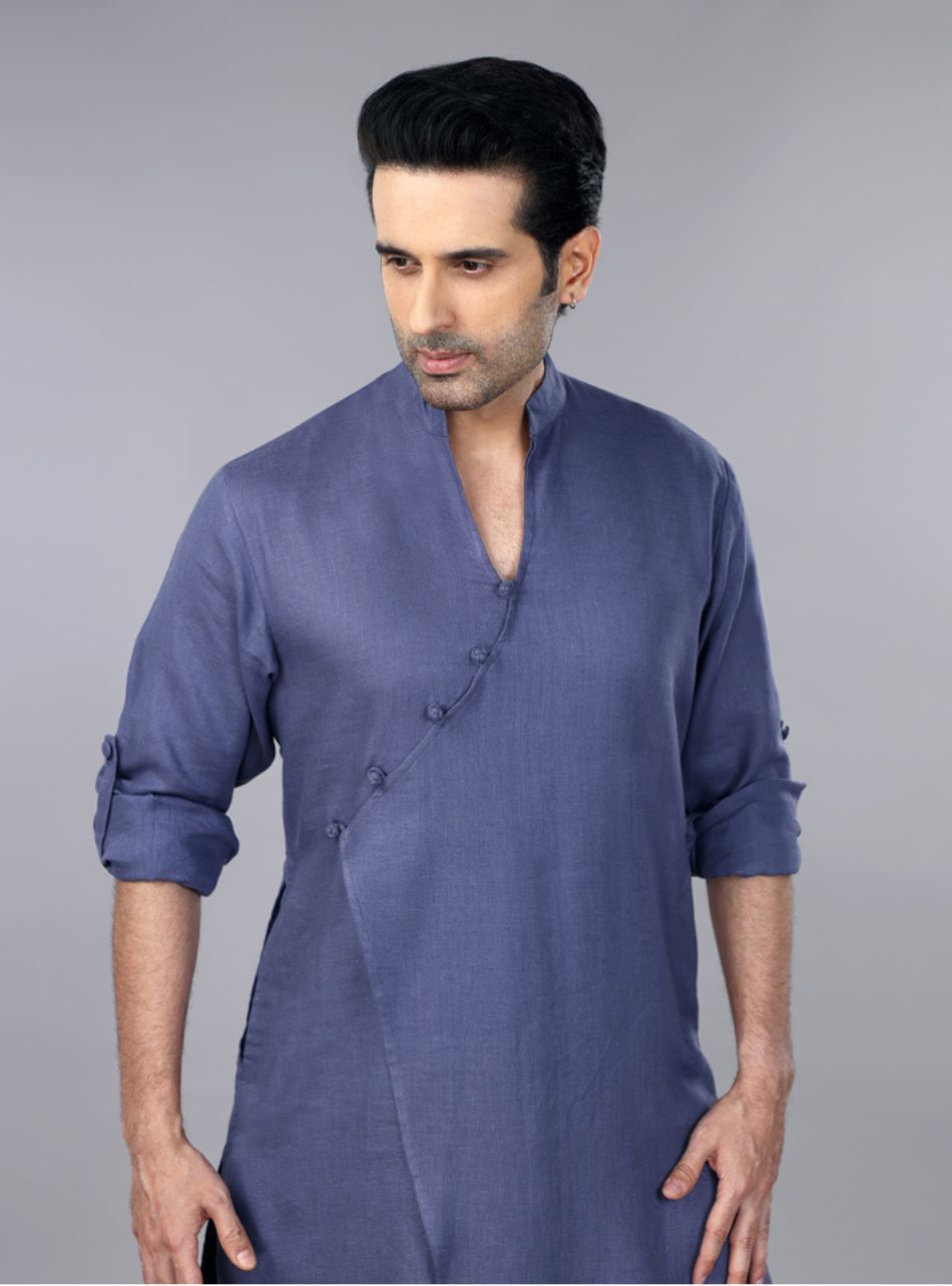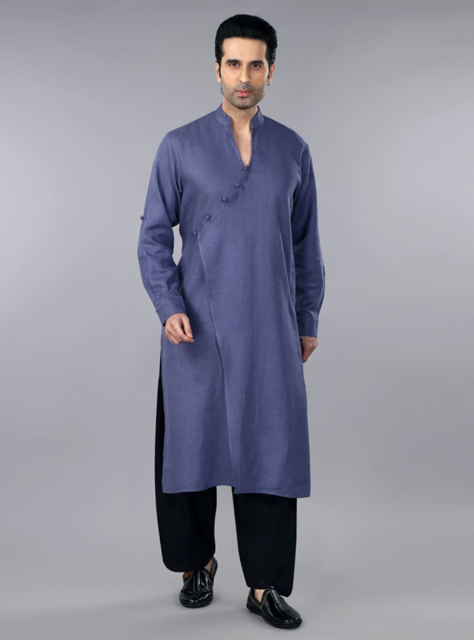 This slate grey pure linen overlap kurta and pleated salwar set is a seamless blend of traditional elegance and modern sophistication. The kurta showcases a unique overlap design, adorned with delicate fabric button detailing that adds an understated charm. Its band collar and long sleeves enhance the refined look, while the soft, breathable linen fabric ensures all-day comfort.