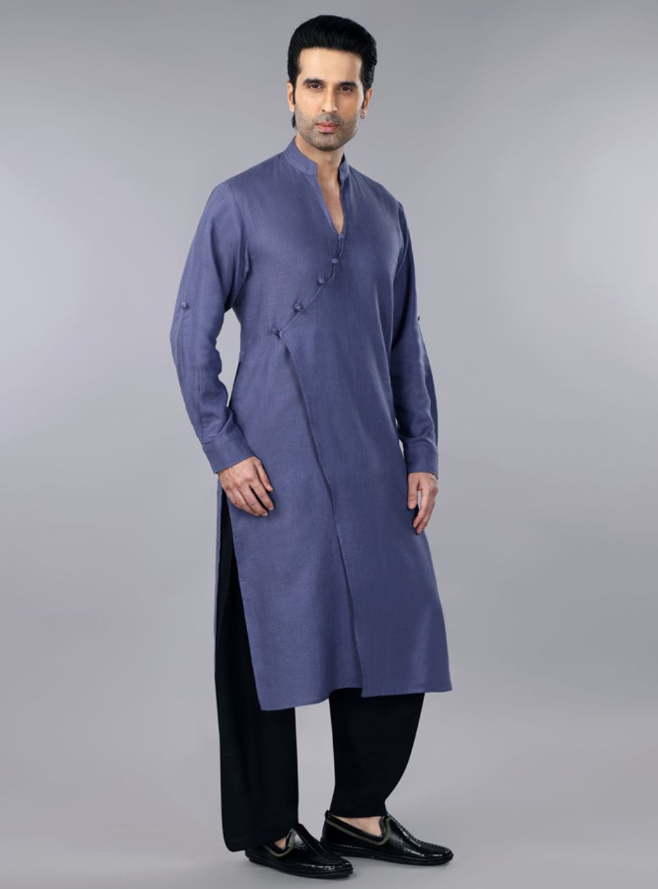 Slate Grey Linen Overlap Kurta & Salwar Set