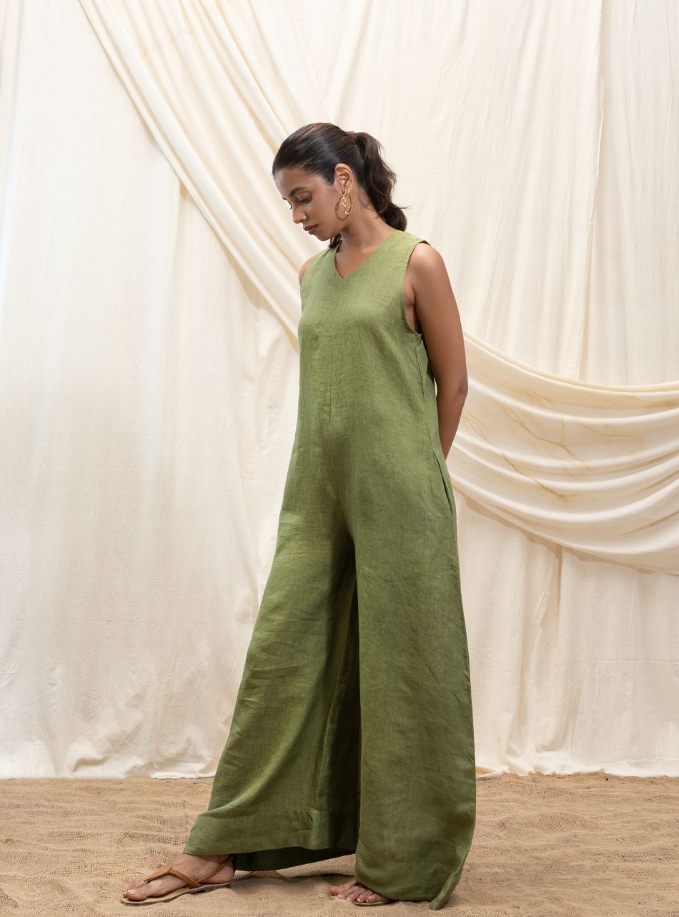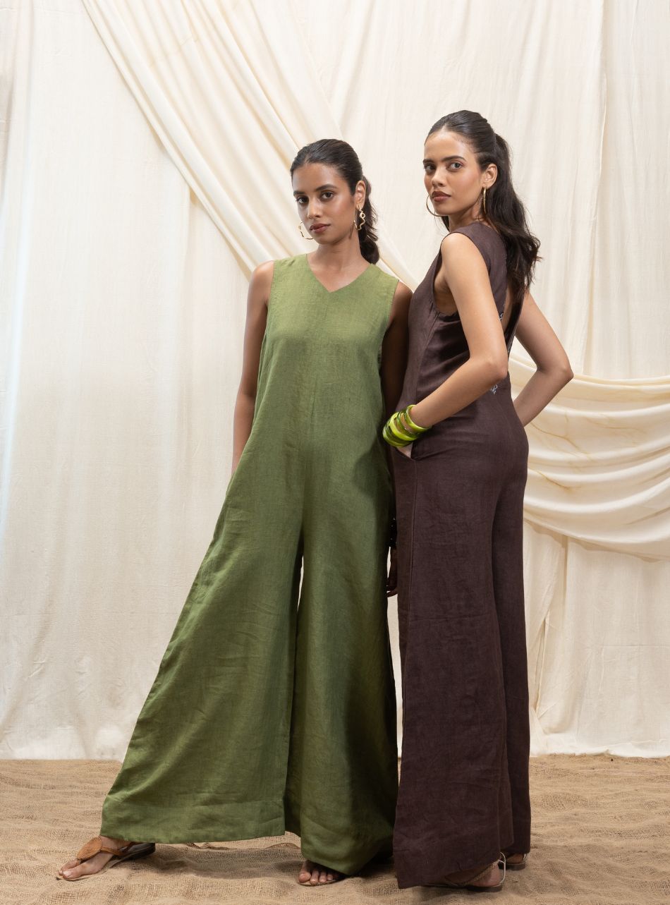 A relaxed-fit, full-length sleeveless jumpsuit designed for effortless style and comfort. The back features an elegant oval-shaped cutout, highlighted with our signature line embroidery in a contrasting shade. A button fastening at the neck ensures a secure fit, while our signature stamp and Akashi logo in Hindi add a distinctive touch. The flared bottoms enhance the flow of the silhouette, giving it a cool, easygoing appeal.