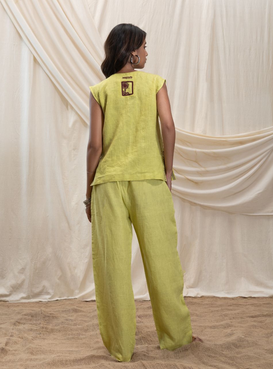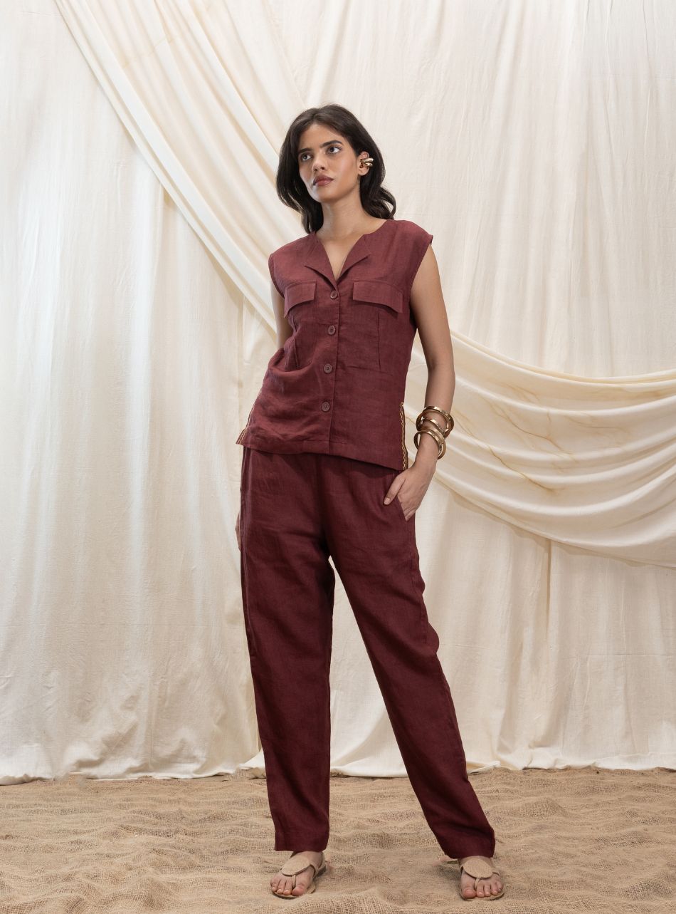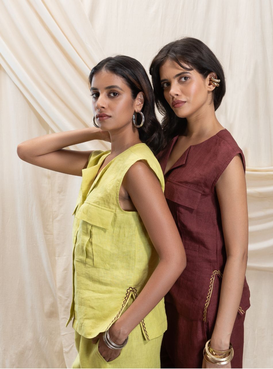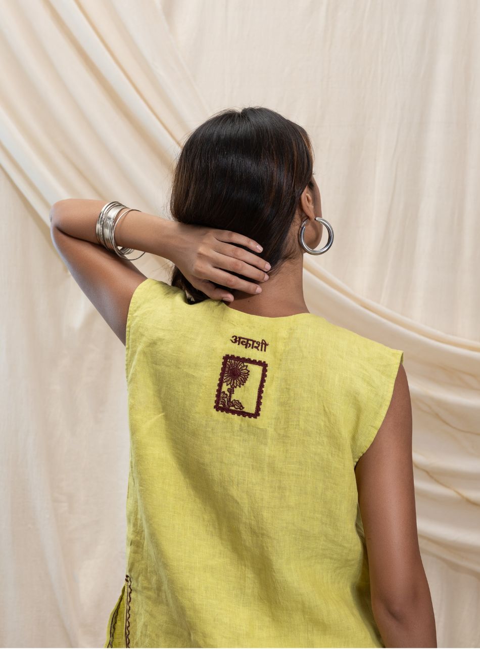 A buttoned sleeveless vest with a sharp V-neck and functional front pockets on either side. The vest features delicate line embroidery along the slit for added detail, while the back is adorned with the Akashi logo and signature stamp.